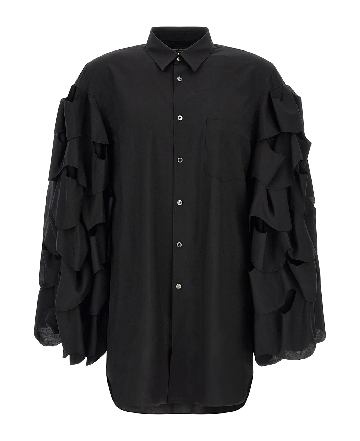Fluid fabric shirt, breast pocket, front asymmetrical button closure, wide long sleeves with draped tone-on-tone inserts and raw cut hem, rounded and asymmetrical hem. Composition: 100% polyester