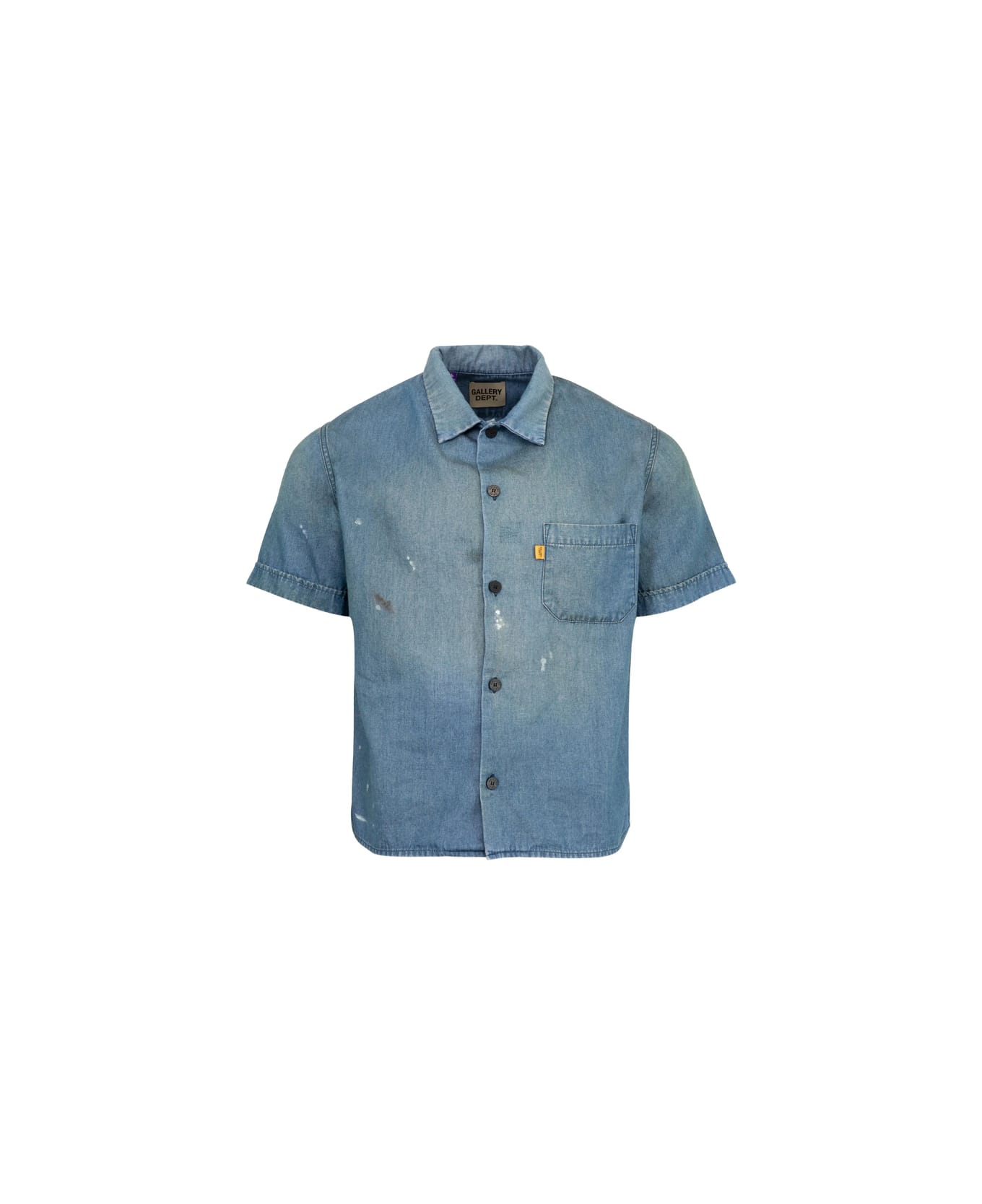indigo blue short sleeves button fastening chest patch pocket embroidered lettering distressed effect