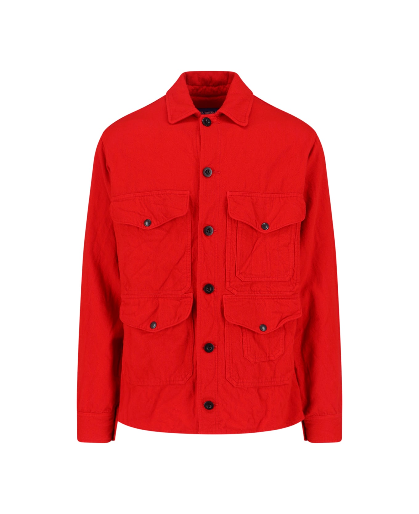 Junya Watanabe X Filson Deck jacket in red wool blend with classic collar, button closure, four front patch button pockets, adjustable side button detail, and straight hem. Composition: 60% Wool, 40% Acrylic