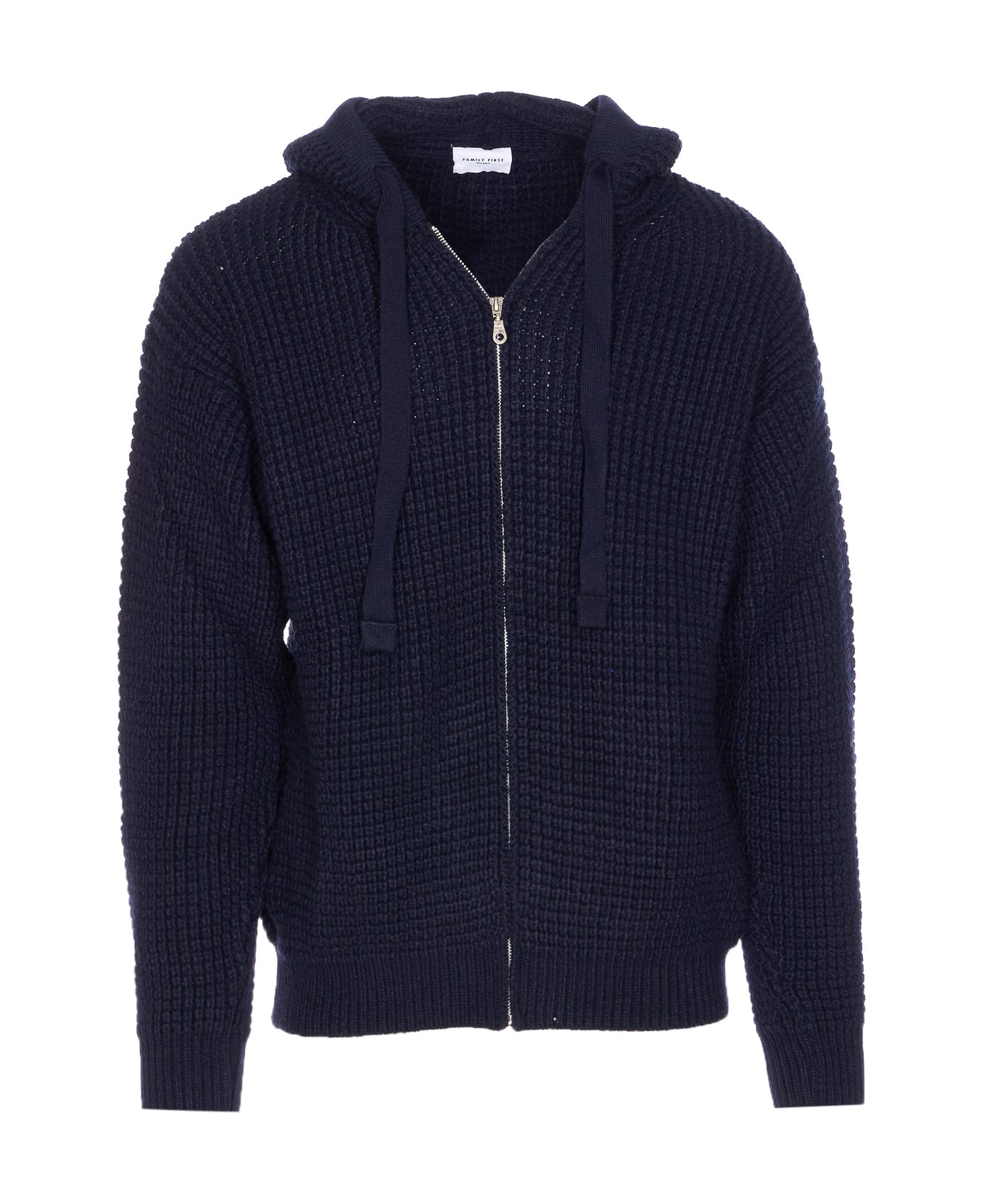 Family First Milano blue knitted hoodie, zip closure, hood with coulisse, long sleeves Composition: 45% Wool, 45% Polyamide, 10% Acrylic