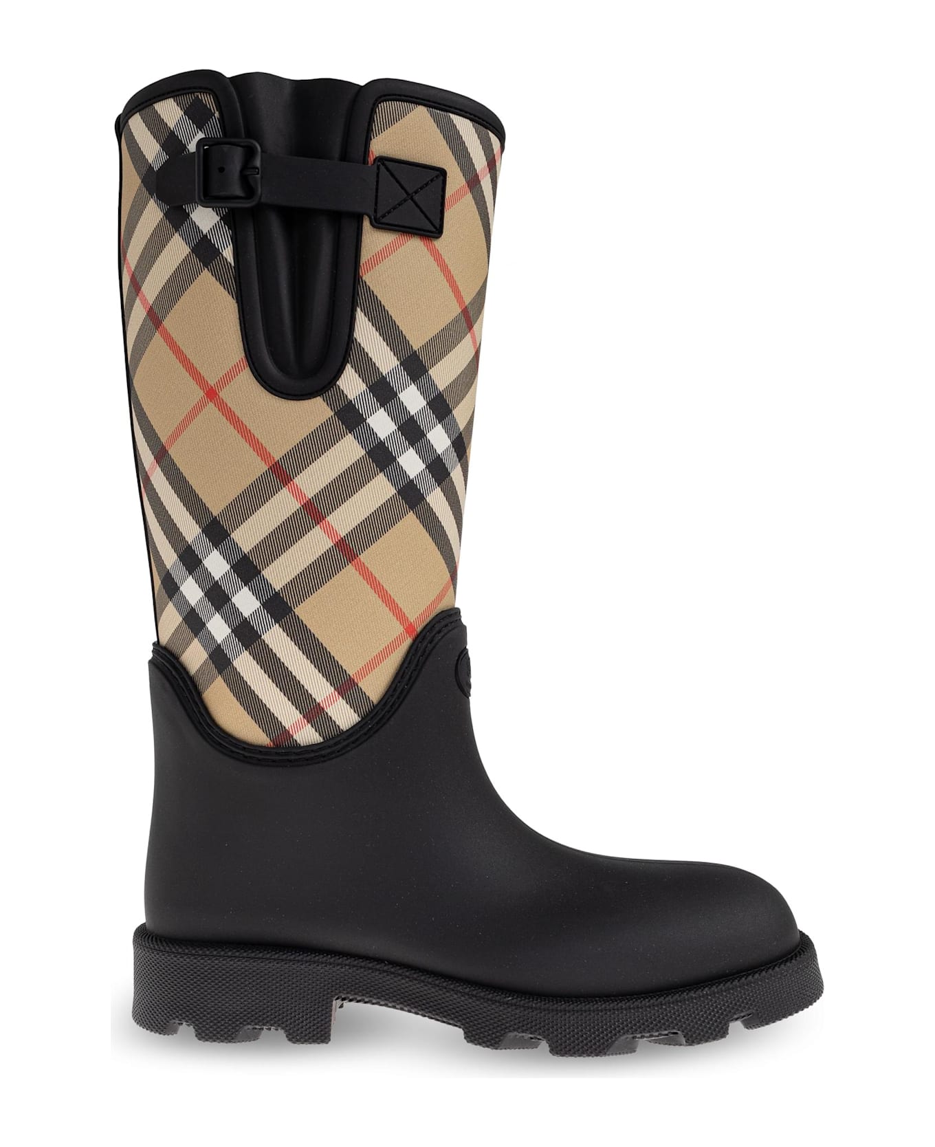 Step into refined sophistication with these Burberry Check Pattern Wellington Boots, crafted for the modern gentleman with discerning taste. The iconic, high-cut silhouette features an elegantly rounded toe and a robust, lugged sole that provides unwavering grip in any weather. A striking, oversized check motif in classic beige, black, white, and red adorns the upper, echoing the aesthetic heritage of Burberry's legendary collections and evoking an unmistakably exclusive character. Expertly constructed from matte black rubber and weather-resistant synthetic fabric, these boots offer exceptional protection against the elements while ensuring a distinguished appearance. Subtle detailing at the shaft adds a touch of sophistication, seamlessly blending function with timeless style. Why choose this product? Signature check design inspired by Burberry's renowned heritage Premium, weatherproof materials for enduring comfort and durability Distinctive silhouette with superior traction for confident strides Ideal for both urban and countryside elegance