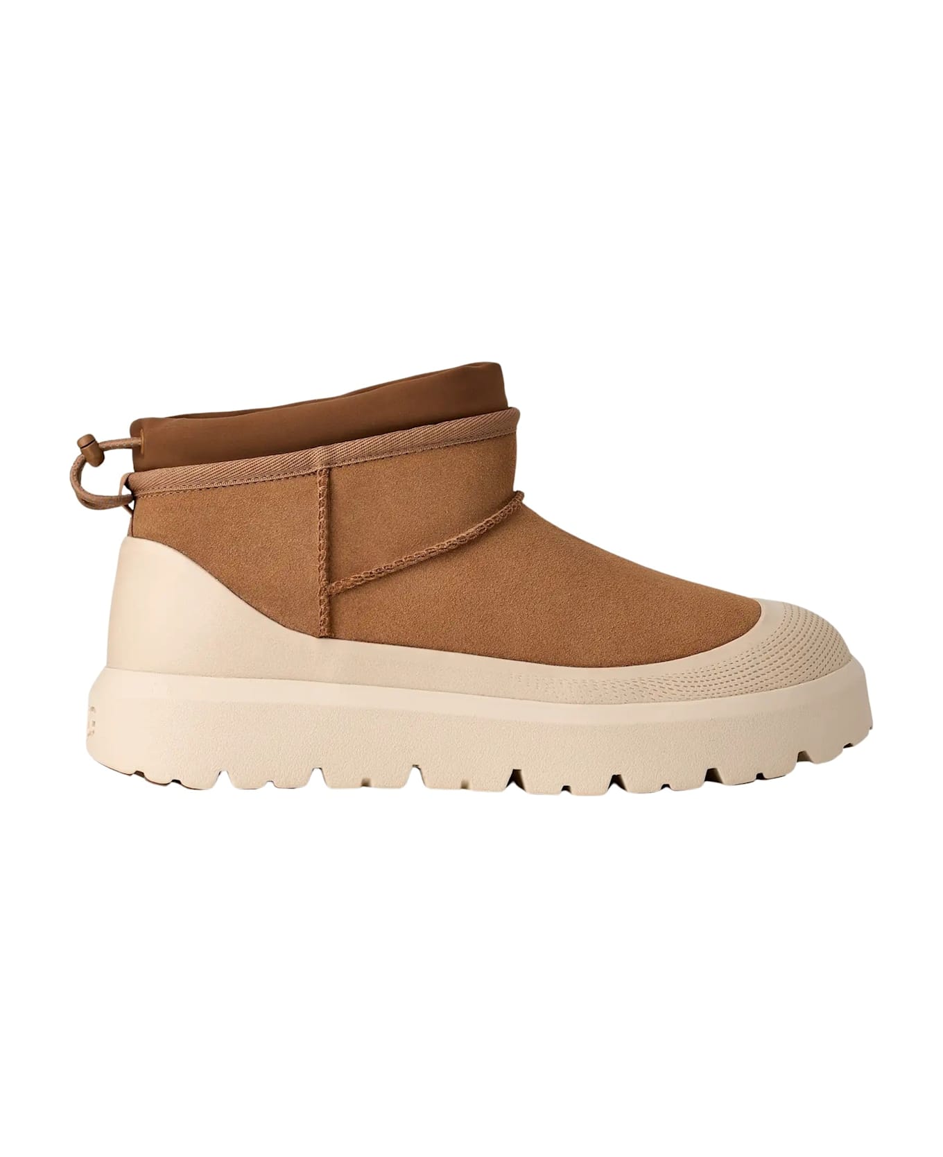 A waterproof short boot that combines UGG s classic silhouette with performance features for wet, cold weather. Waterproof suede upper with seam-sealed construction, an adjustable weather shield, and both lining and insole in 17? mm UGGplush (upcycled wool and lyocell) that keep warmth down to -20? °C. The outsole is sugarcane-based EVA with Spider Rubber® pods for enhanced grip on slippery surfaces ideal for light rain or snow. Color is Chestnut with Whitecap accents a rich brown base softened by off-white details, creating a subtle yet eye-catching contrast.