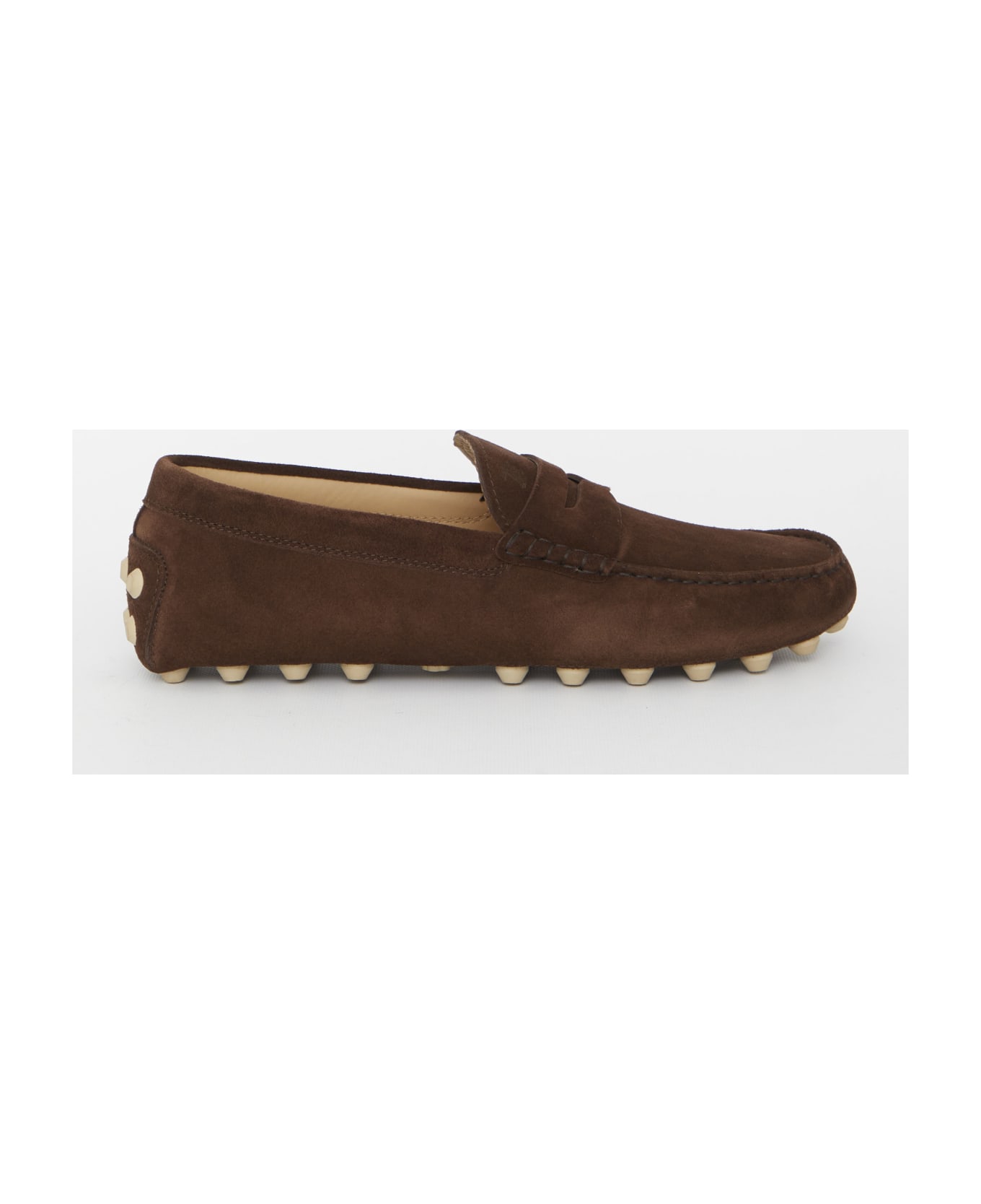 Macro 52K Gommino loafers in brown suede with embossed Tod's monogram on the upper and exposed handmade stitching. Rubber pebble detailing on the heel and iconic rubber pebble outsole. UK size.