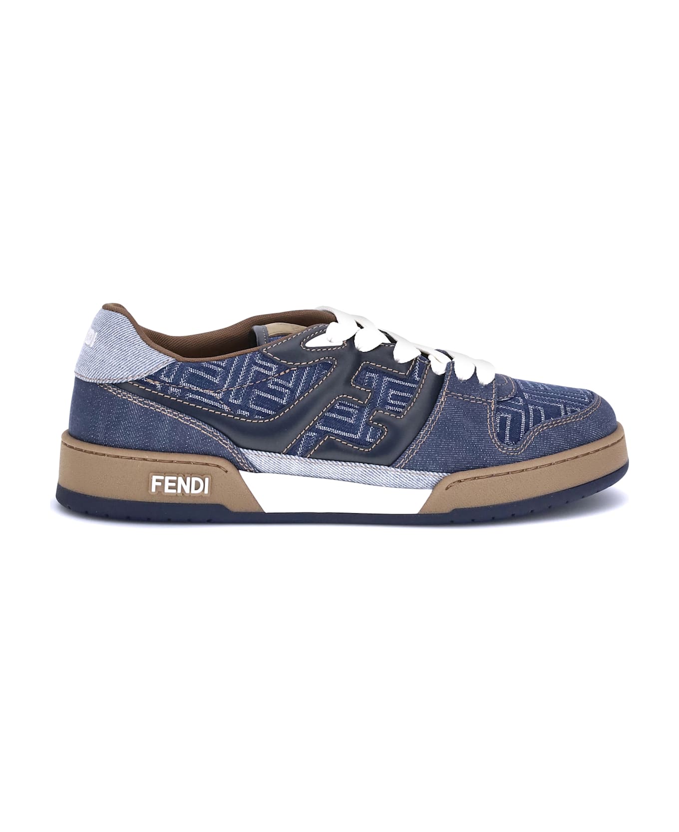 Fendi's lace-up sneakers combine urban style and iconic details. crafted from blue denim-effect ff jacquard, they are enriched with contrasting leather-colored stitching and a padded dark blue leather ff appliqué on the side. completed with a rubber sole with fendi lettering, they offer a perfect mix of comfort and distinctive character.