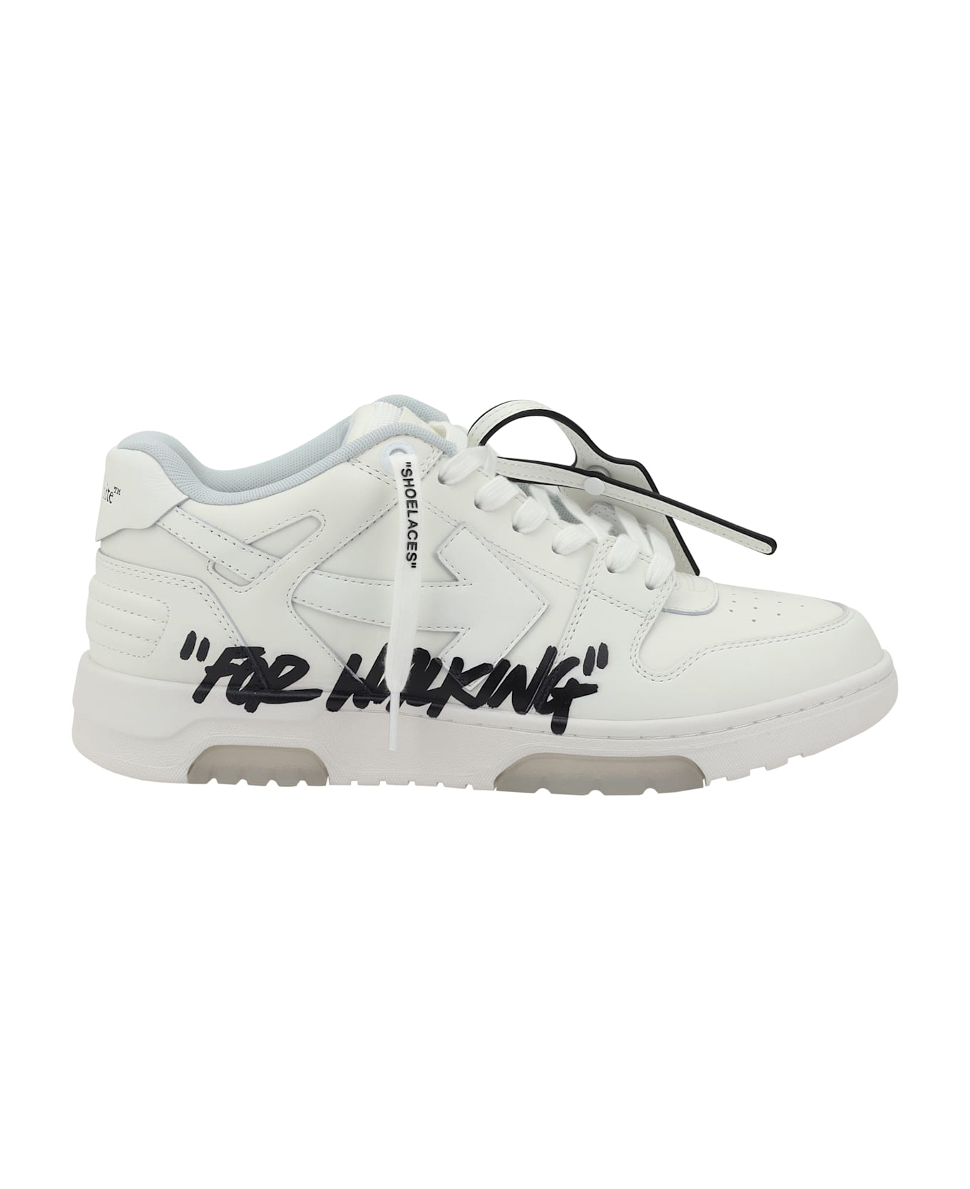 Leather out of office for walking sneakers from off-white feature a perforated round toe for breathability and a front lace-up closure. the paneled design is enhanced by the distinctive arrows motif on the side panel, while the zipper tie logo tag adds a distinctive detail. ankle padding and a logoed tongue provide comfort, while a logoed insole and flat sole complete the look. the logoed heel adds an extra touch of style.