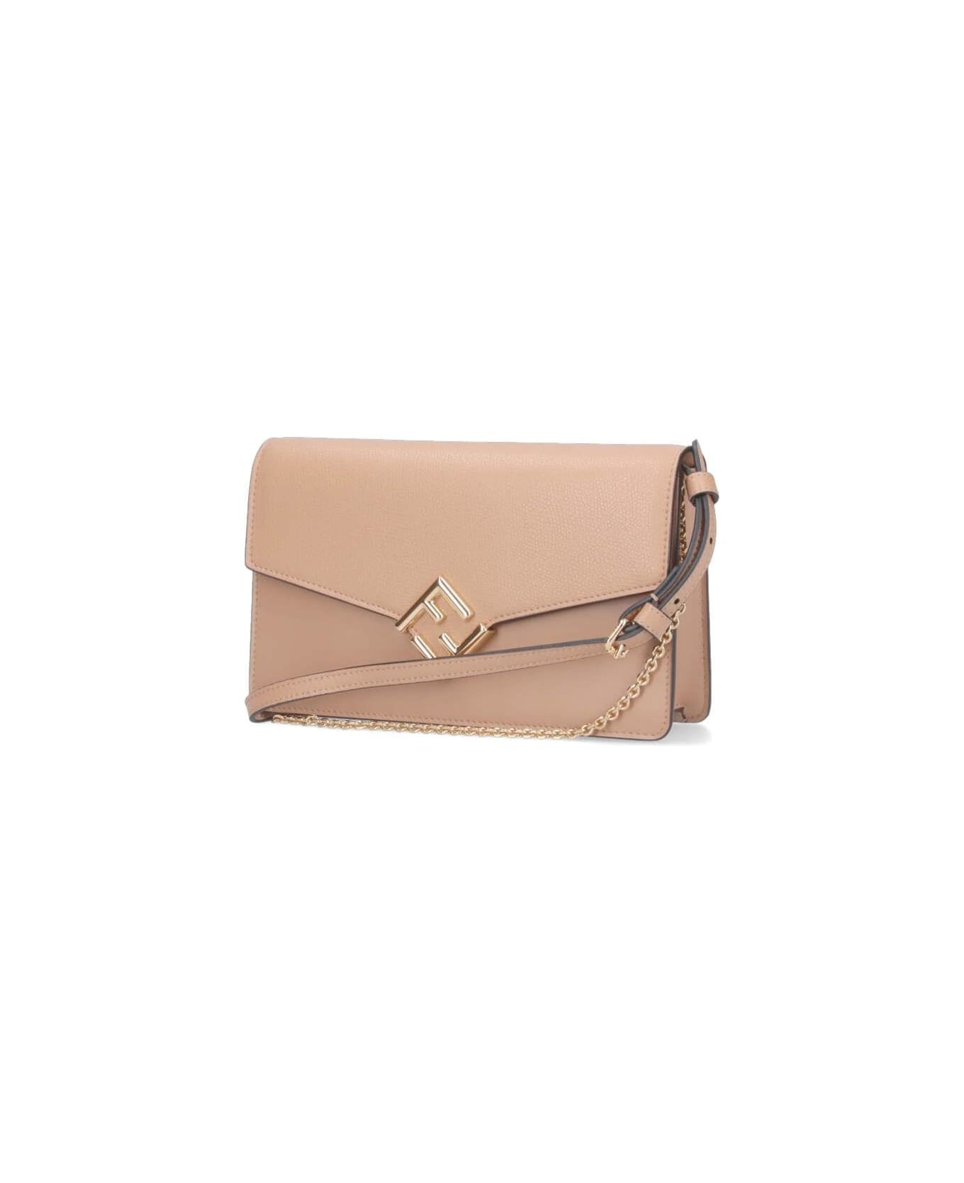 Fendi FF Diamonds chain wallet in hammered beige leather with snap button closure, adjustable and removable beige leather shoulder strap, gold adjustable and removable chain, gold metal logo on the front, interior flat pocket, main interior compartment, and six interior card slots.