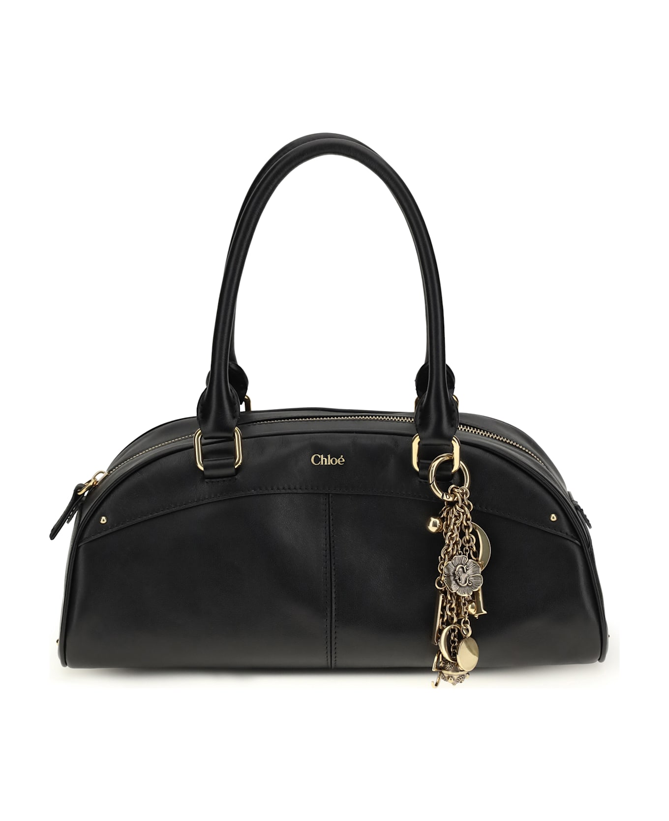 The bowling handbag by chloé, crafted from smooth calfskin leather, features a structured, rounded silhouette with sturdy top handles. the interior includes a large main compartment and flat pocket, while the zipper closure provides convenience and security. the removable golden key ring, embellished with dangling charms and the letters chloé, adds a distinctive touch and celebrates the elegance of the maison's heritage.