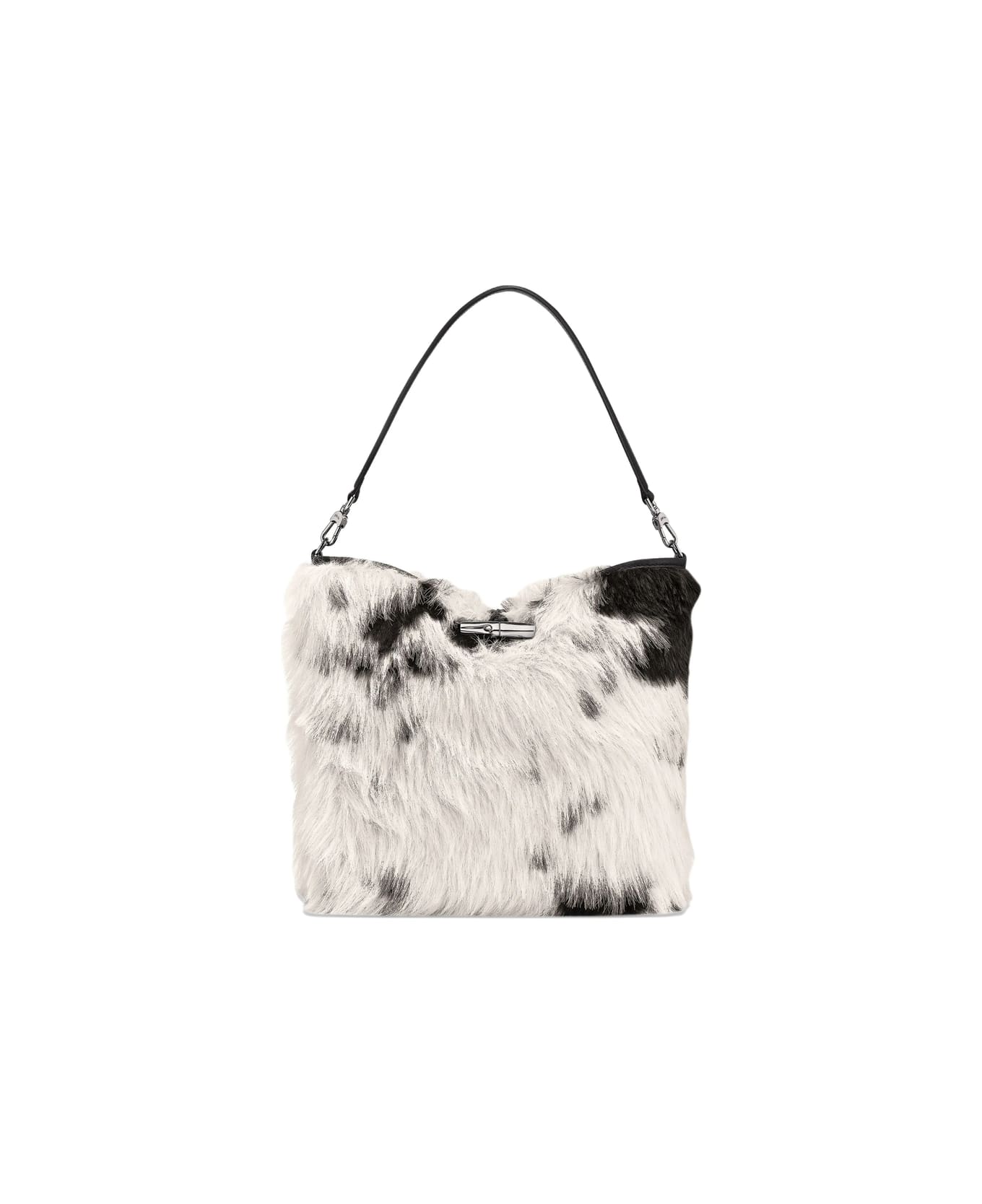 black and white faux-fur leather top handle clasp fastening canvas shepherd's check pattern