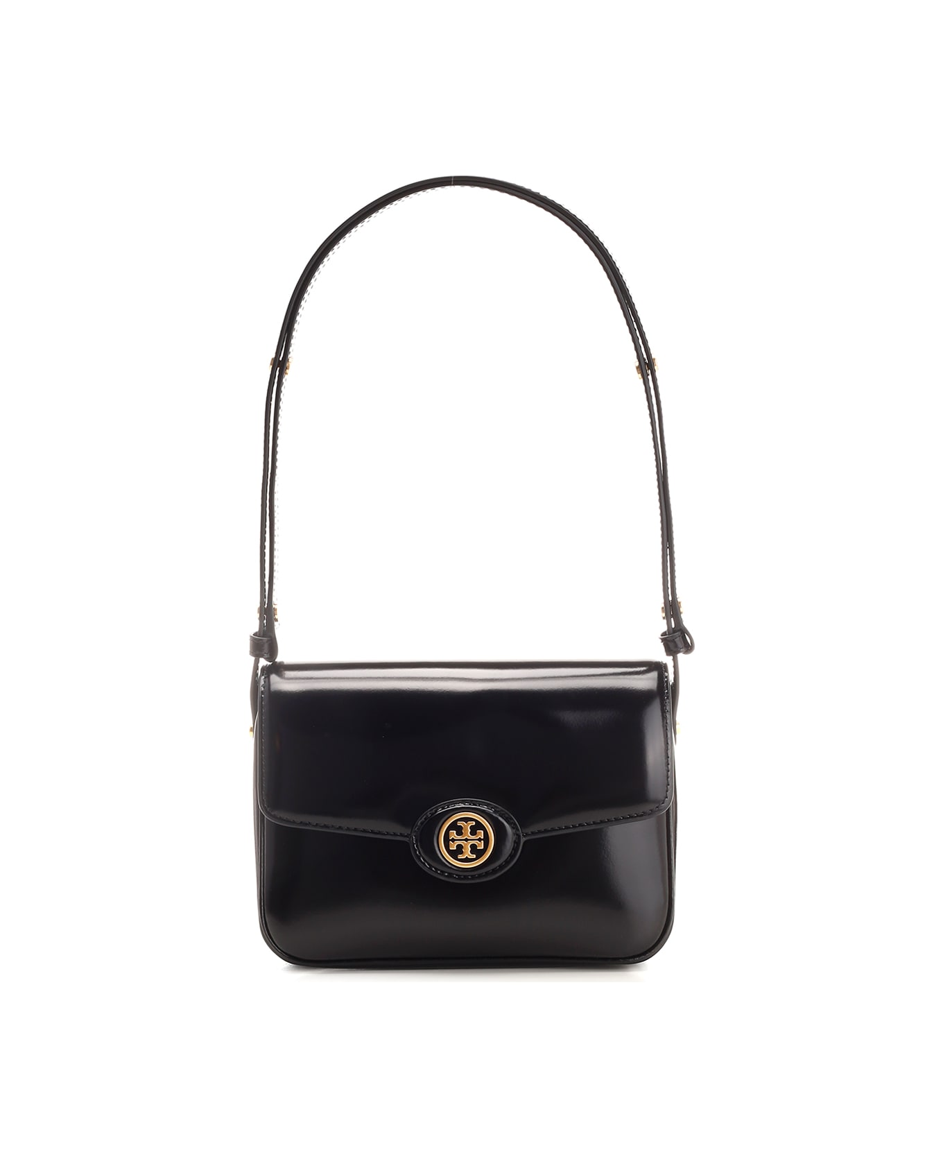 Black 'Robinson' shoulder bag from Tory Burch in shiny leather, microfibre lining with faux suede finish, brass details, flap with magnetic closure, one internal welt pocket.