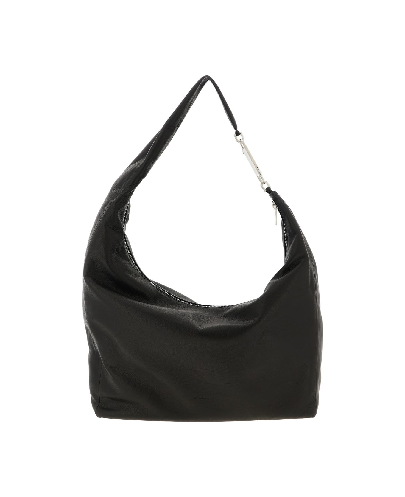 black leather zip closure snap hook logo detail