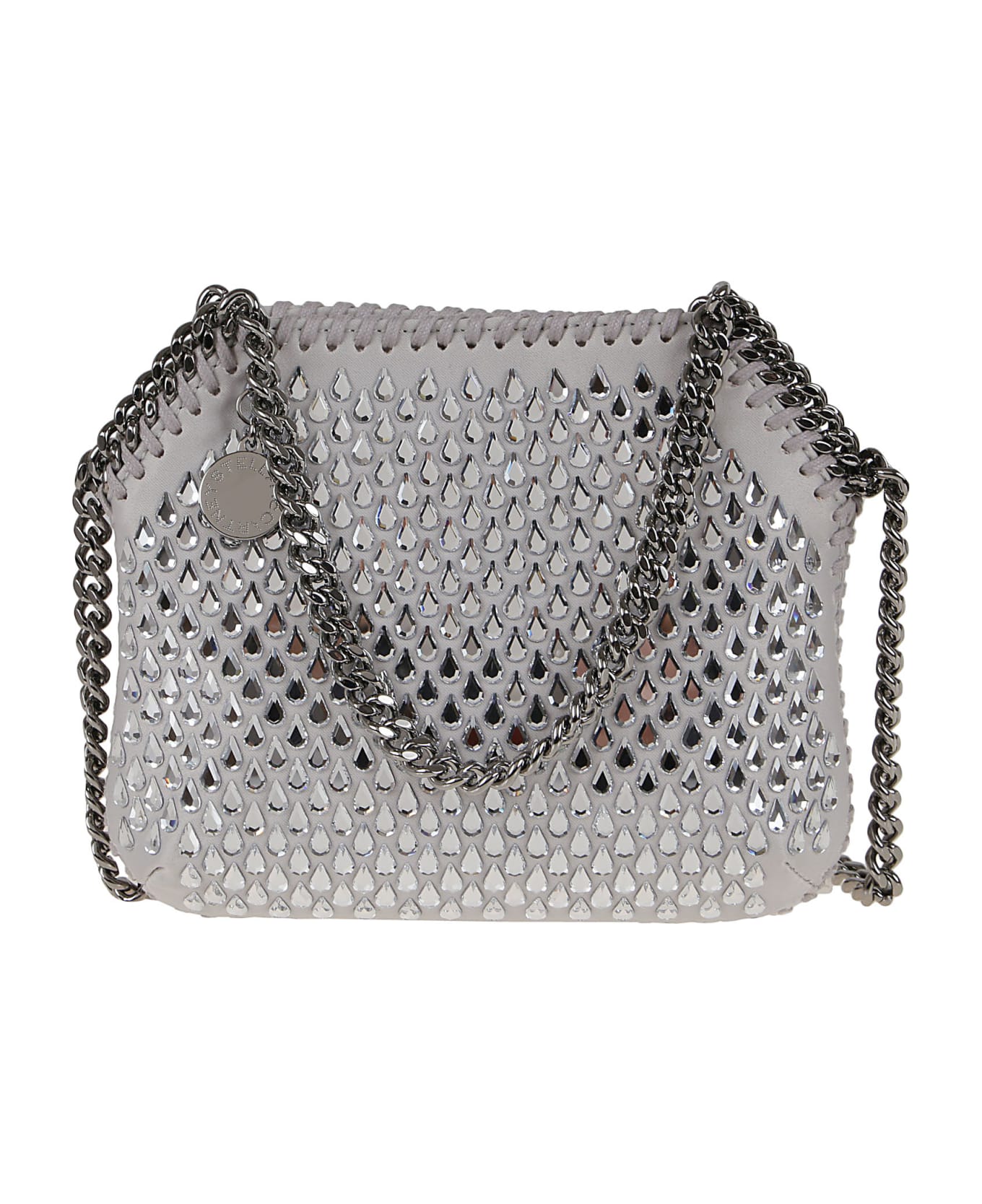 Falabella BY STELLA McCARTNEY mini tote bag. Magnetic closure; internal slip pocket. Characterized by a silver chain that follows the perimeter of the bag forming the handles on the top, Stella McCartney logo medal, a third chain that allows the bag to be worn crossbody or on the shoulder. Embellished with mesh with crystals.