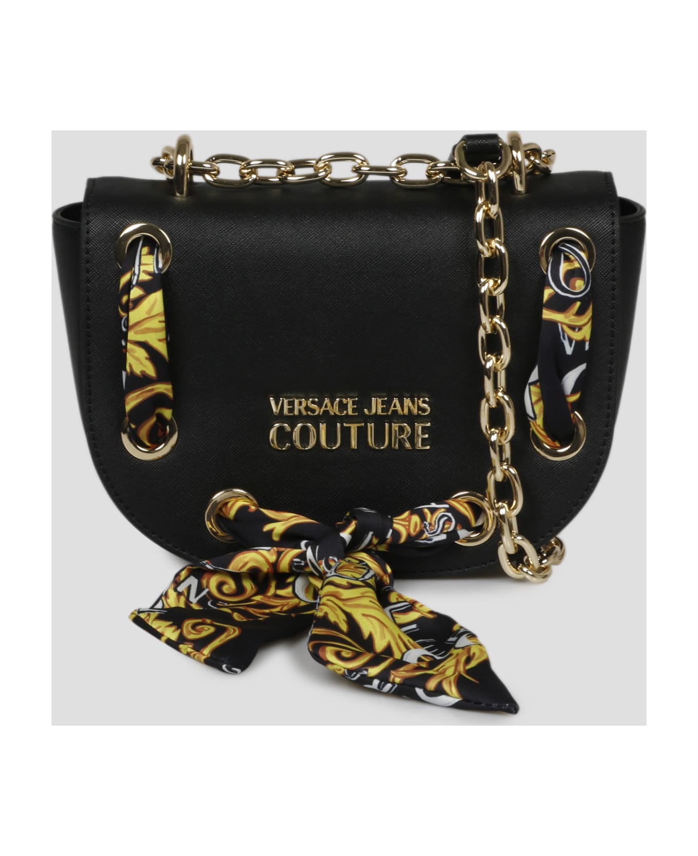 Versace Jeans Shoulder bag , in saffiano leather embellished with a detachable scarf. - SS23 - Crescent shape - W:20cm H:15cm D:7cm - Sliding chain shoulder strap - Metal logo on the front - Magnetic closure - Gold -toned hardware - Inside: 1 flat pocket - Made in China