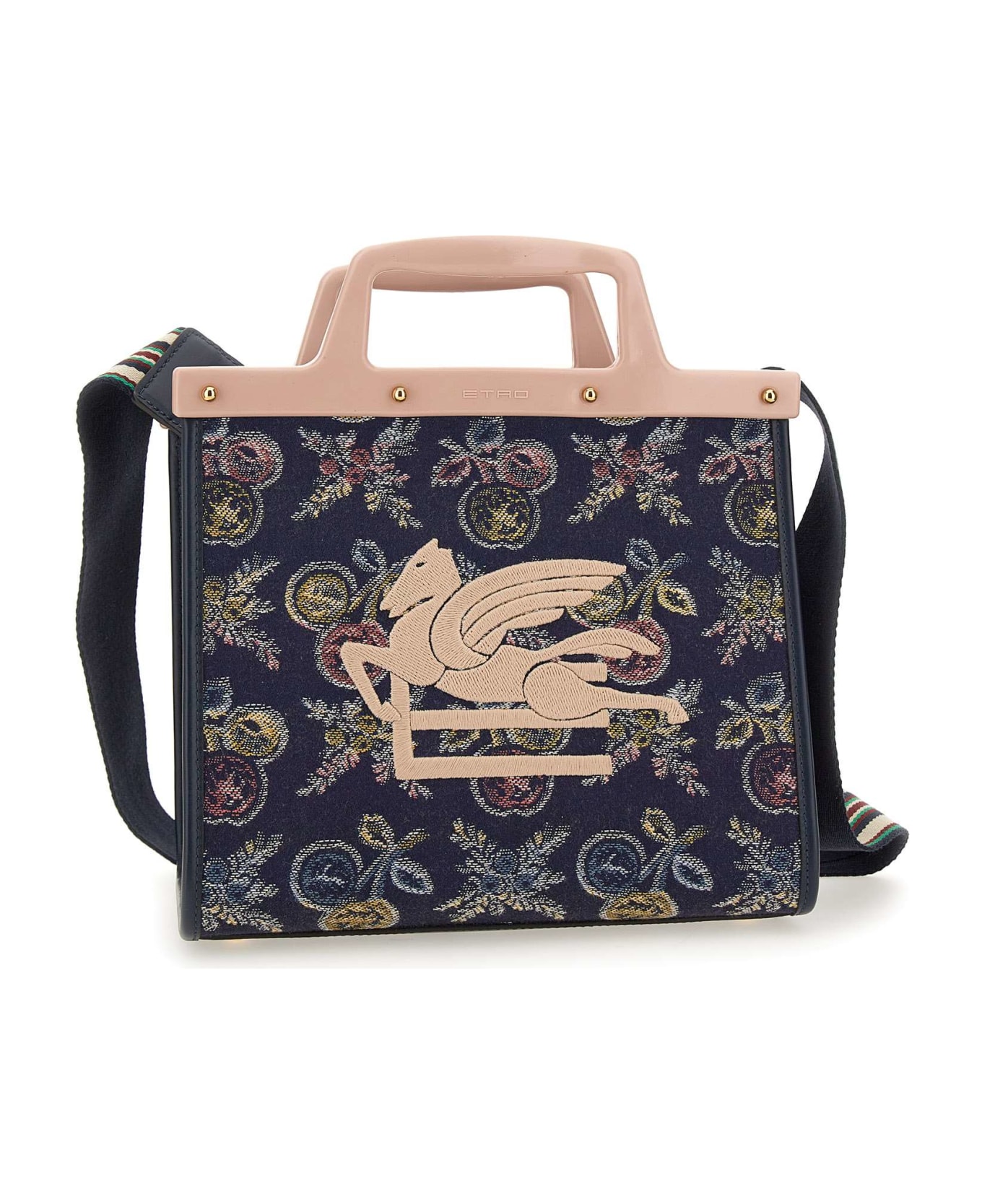 Etro "Love Trotter" archival jacquard velvet with multicolor meline on a midnight blue background handbag, three-dimensional thread embroidered Pegaso logo, contrasting internal lining in striped jacquard fabric, double top handle in old pink recycled plastic, adjustable and removable ribbon shoulder strap, metal feet, gold metal accessories, inside pocket. Measurements: 27 x 23 x 18 cm. Made in Italy.