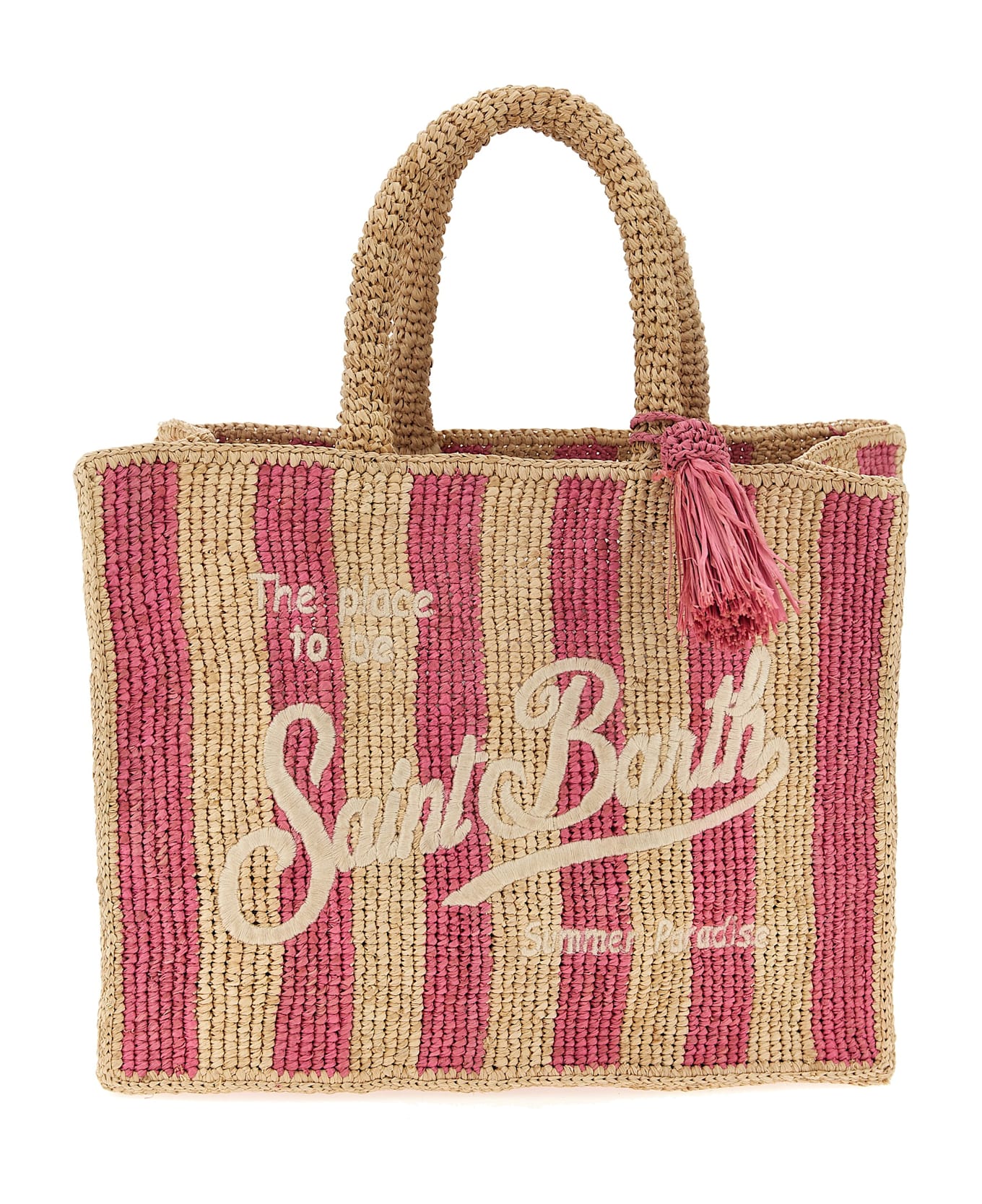 'Colette' handbag in woven raffia, front logo embroidery, double fixed handle. Handcrafted product, any imperfections are to be considered characteristics of uniqueness. Composition: 100% raffia