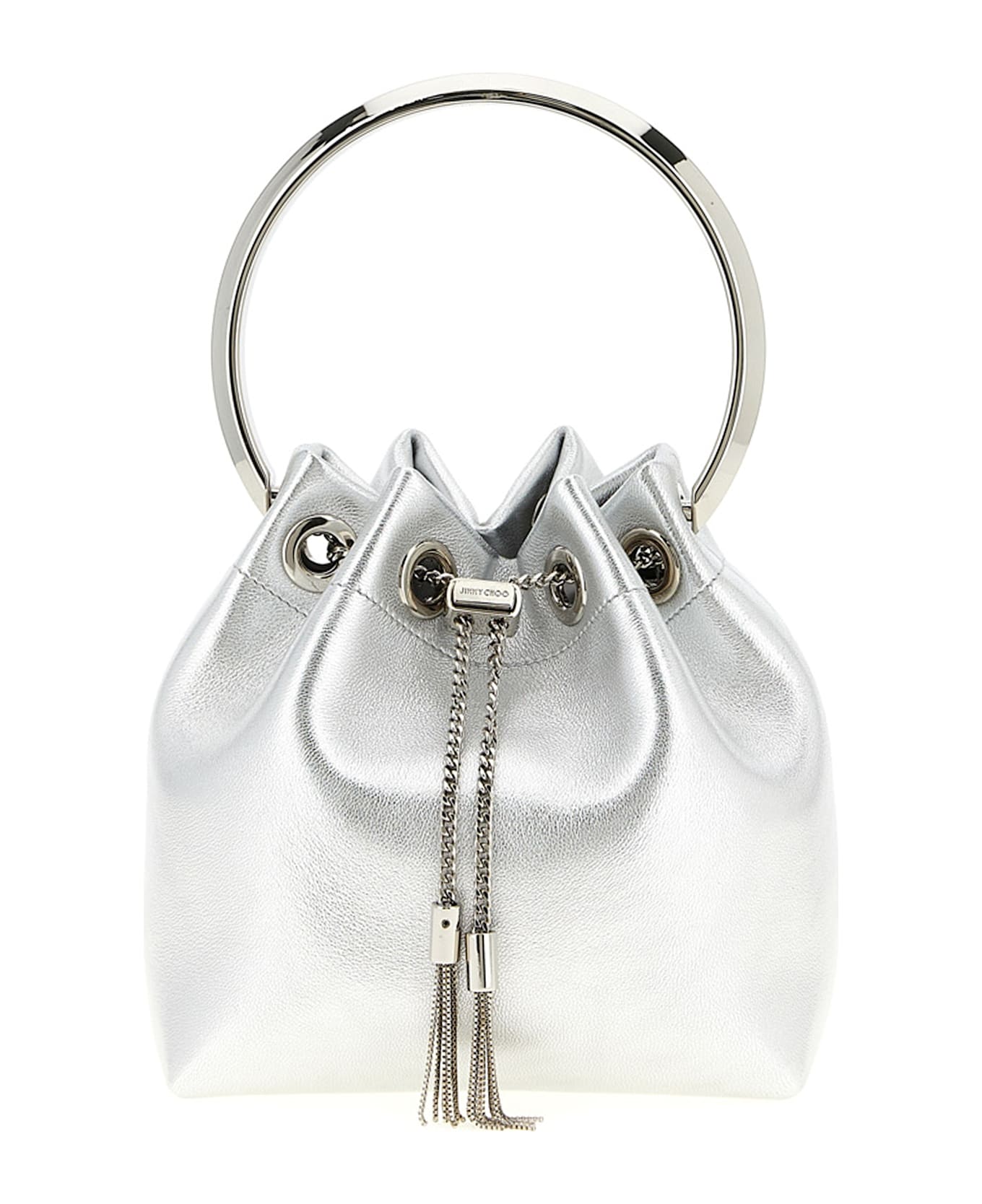 Diwali capsule 'Bon Bon' bucket bag in metallic-effect nappa leather, metal bracelet handle, chain drawstring closure with tassels, chain shoulder strap. Composition: 80% lamb leather 20% brass