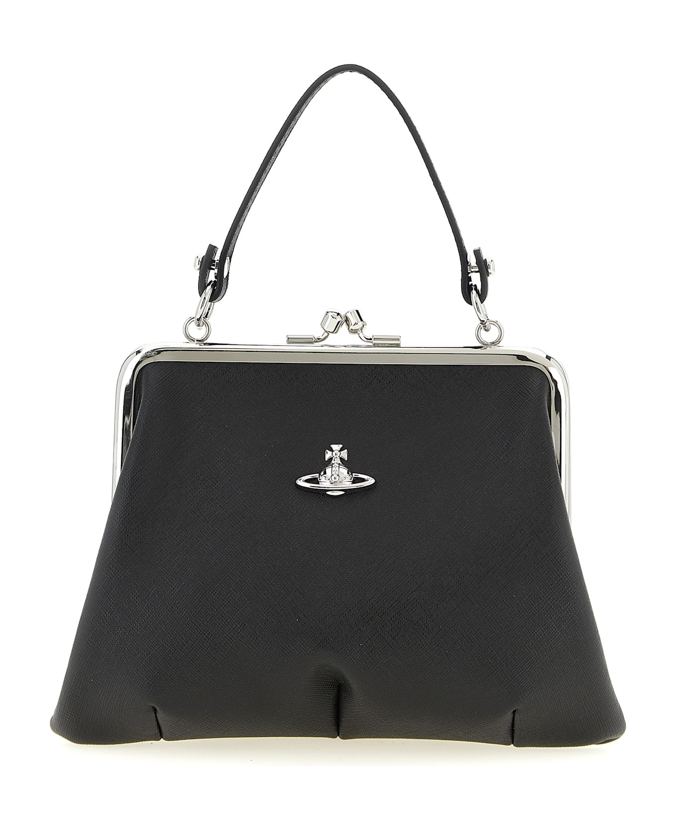 'Granny Frame' PU handbag with Saffiano finish, front metal Orb logo, snap closure, removable handle, cotton lining, removable chain shoulder strap. Composition: 65% polyurethane, 35% cotton