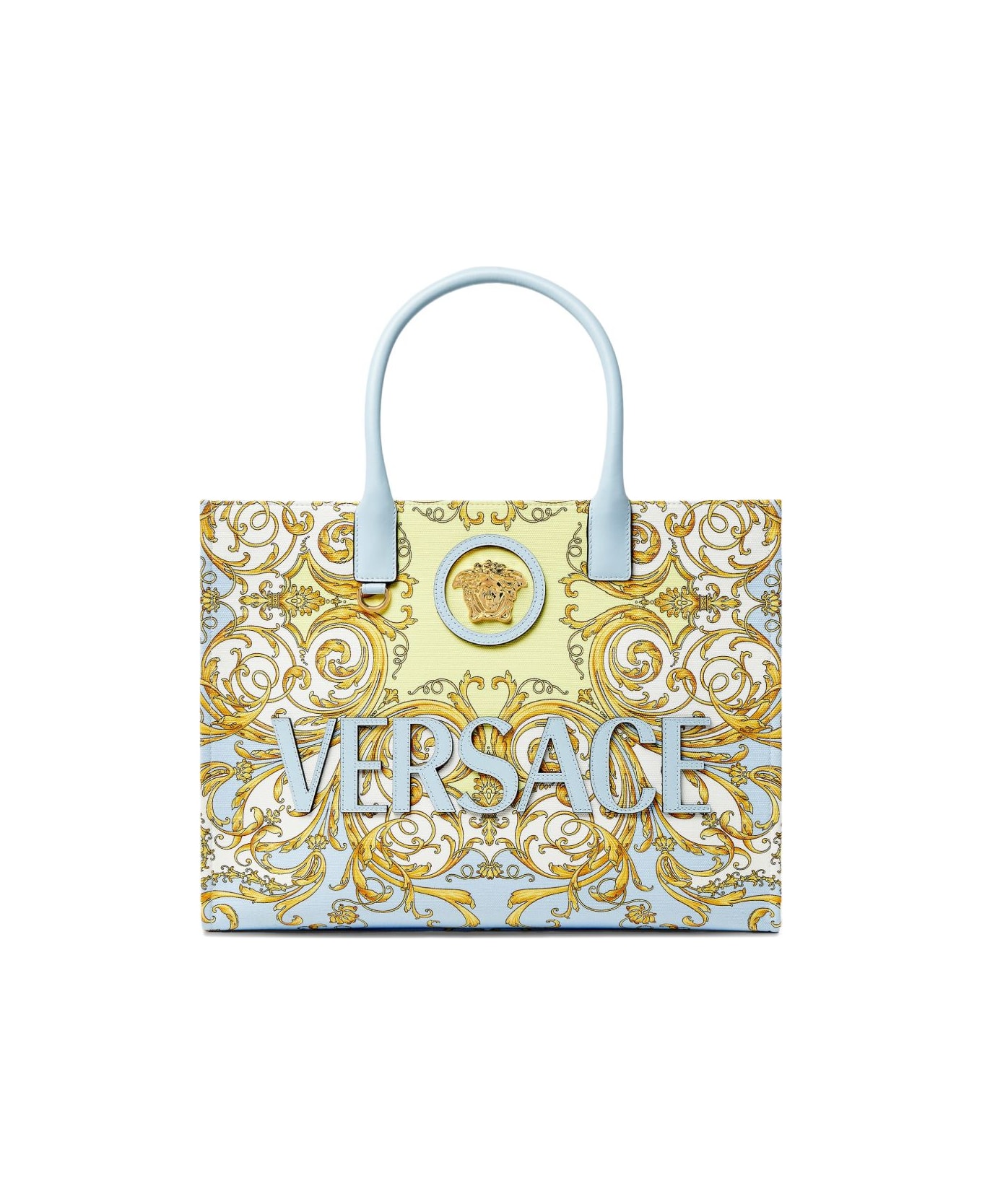 light blue Baroque print top handles Medusa plaque Composition: Lining:, 100% Cotton; Outside:, 100% Cotton; Trim:, 100% Calf Leather
