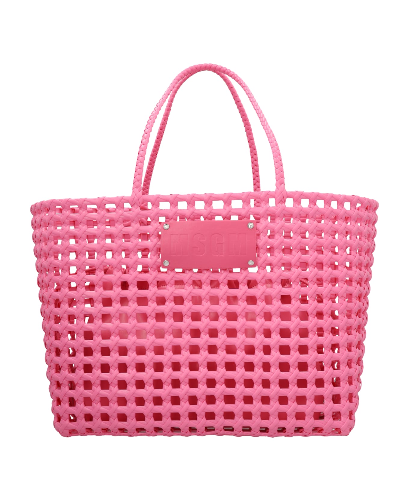 Weaved plastic shopping bag with front leather logo patch, double handle, an inner removable leather clutch bag with drawstring closure.