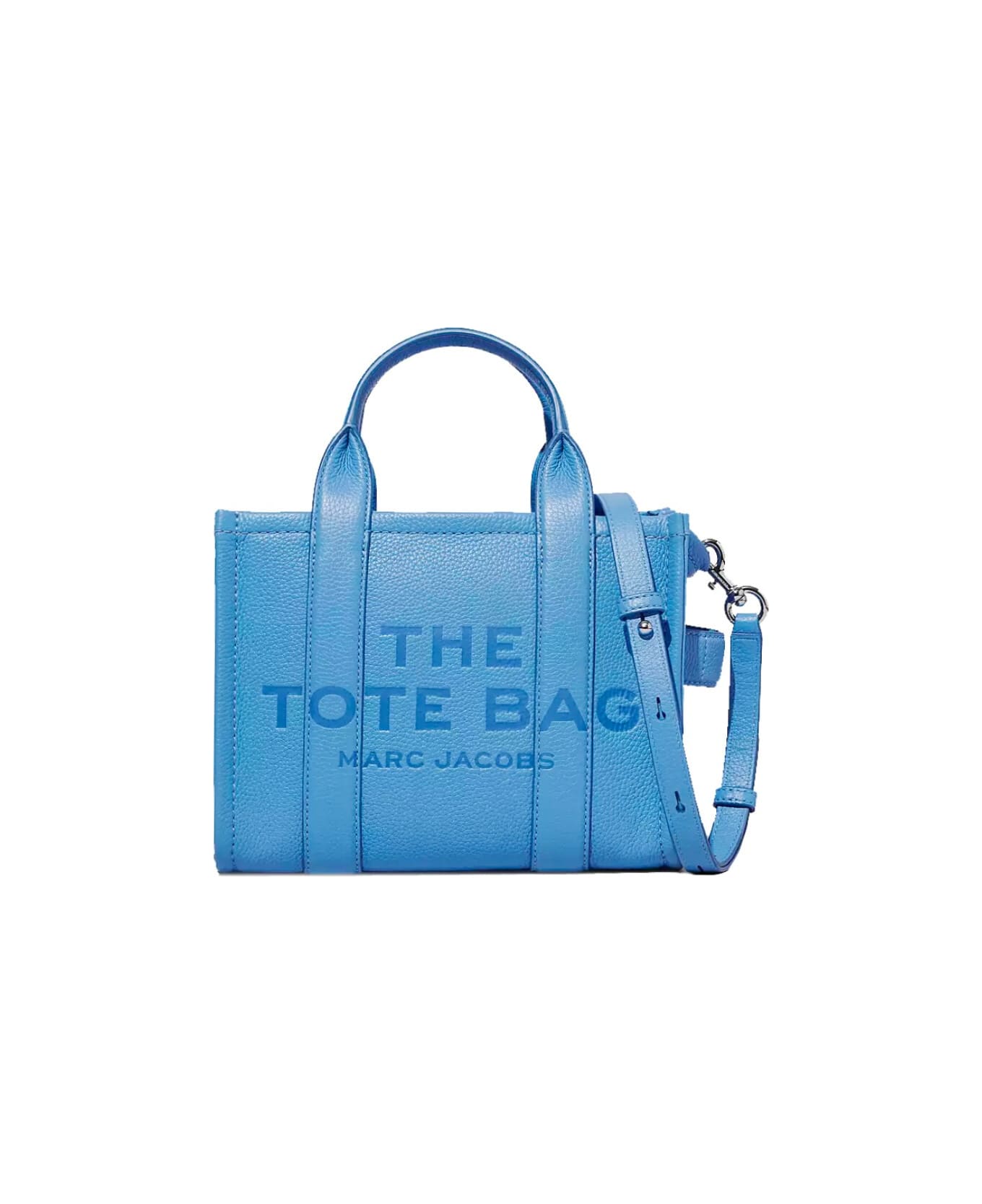 The Leather Mini Tote handbag by Marc Jacobs made of light blue textured leather with front logo. Details in silver metal. Interior with slip pocket, zip closure, adjustable and removable shoulder strap. Measures 26x13x21 cm. Composition: 100% textured leather.