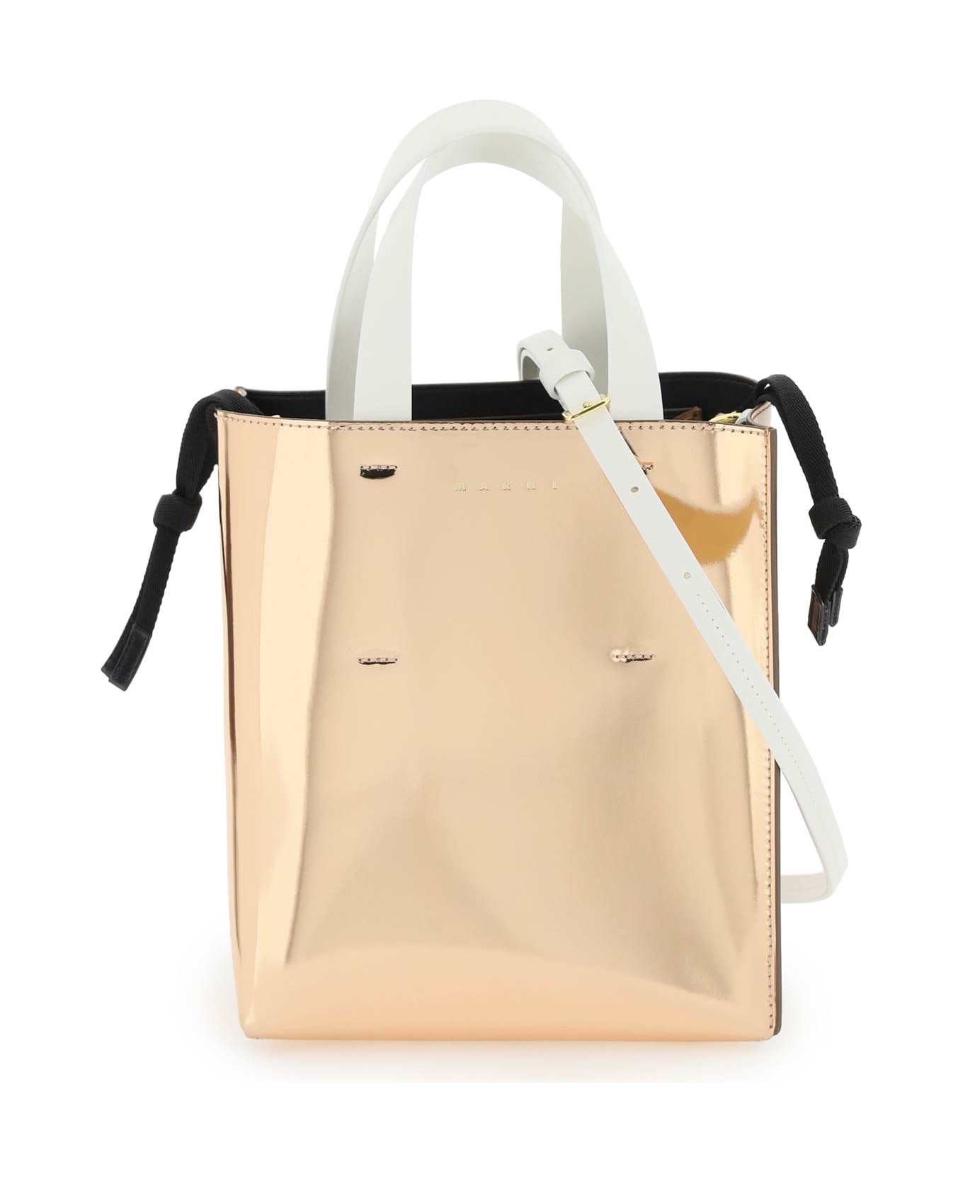 smooth and laminated leather with double handle and detachable and adjustable shoulder strap in contrasting leather. Embossed lettering logo on the front, leather interior with one open flat pocket, and removable cotton fabric pouch with drawstring closure, gold-tone metalware.