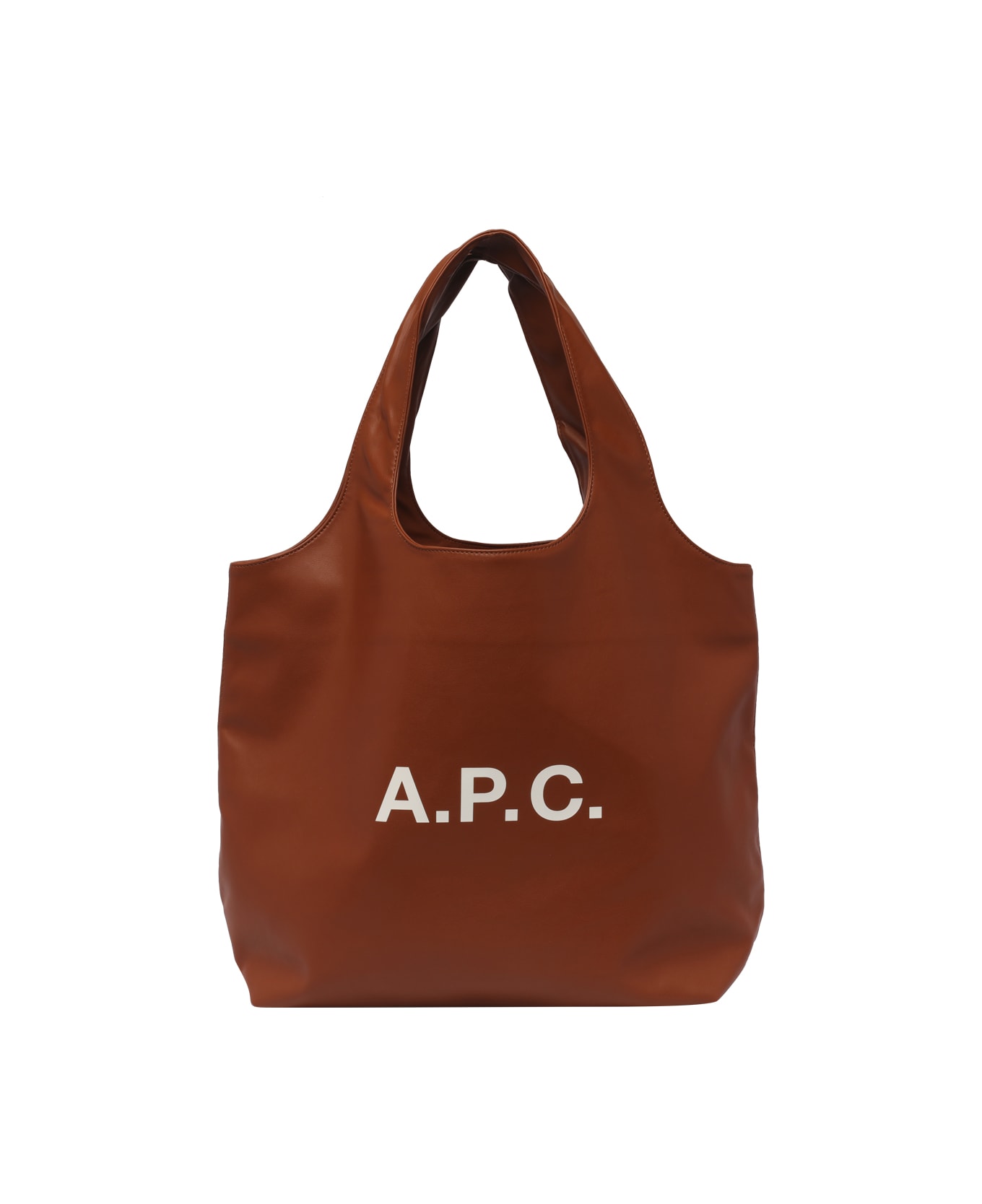 A. P. C. brown Ninon tote, one inner open pocket, two handles, frontal print Composition: 5% Calcium Carbonate, 40% Polyester, 55% Polyurethane