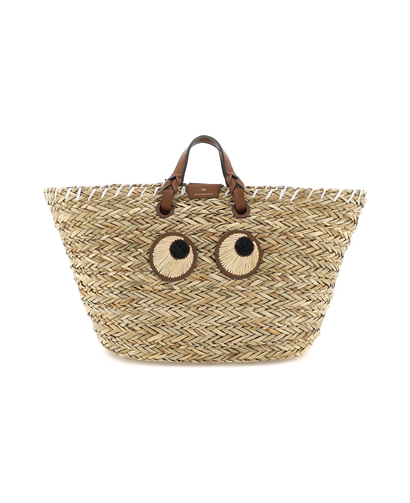 Anya Hindmarch's "Paper Eyes" handbag crafted in woven seaweed with double leather handles and iconic applique eyes. Top drawstring closure and unlined interior with one flat leather pocket.