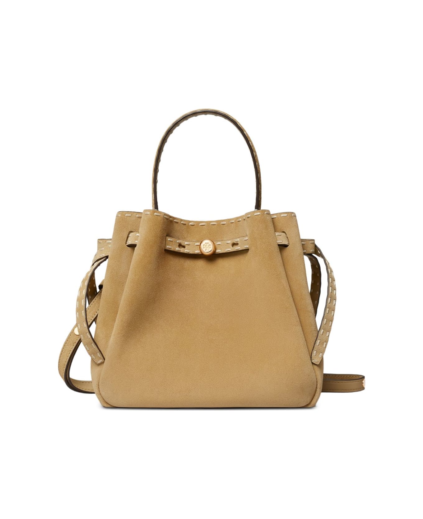 beige suede top handle detachable shoulder strap pick stitch detail drawstring fastening tonal logo plaque This piece comes complete with a protective dust bag.