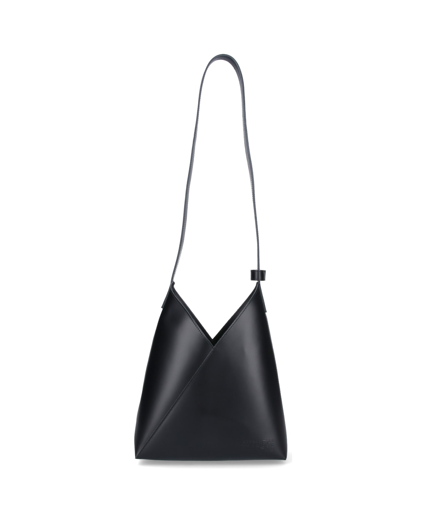 MM6 Maison Margiela 'Fortune Cookie' small shoulder bag in black smooth leather with folding design, shoulder strap, strap detail with snap button, Numeric logo embossed on the front, iconic contrast stitching at the back, main inner compartment.