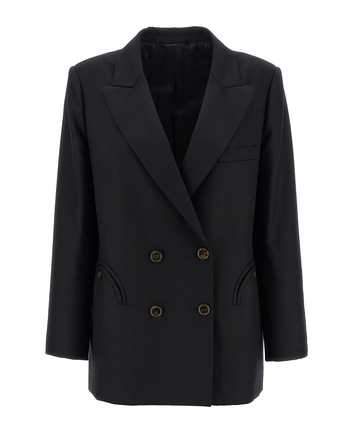 'Alcanara Everynight' double-breasted blazer in lightweight virgin wool twill with front tortoiseshell button closure, peak lapels, breast pocket, 'Smiley' pockets, four inner pockets, long sleeves, square shoulder with slightly padded shoulder strap, back vents, monogram viscose lining.