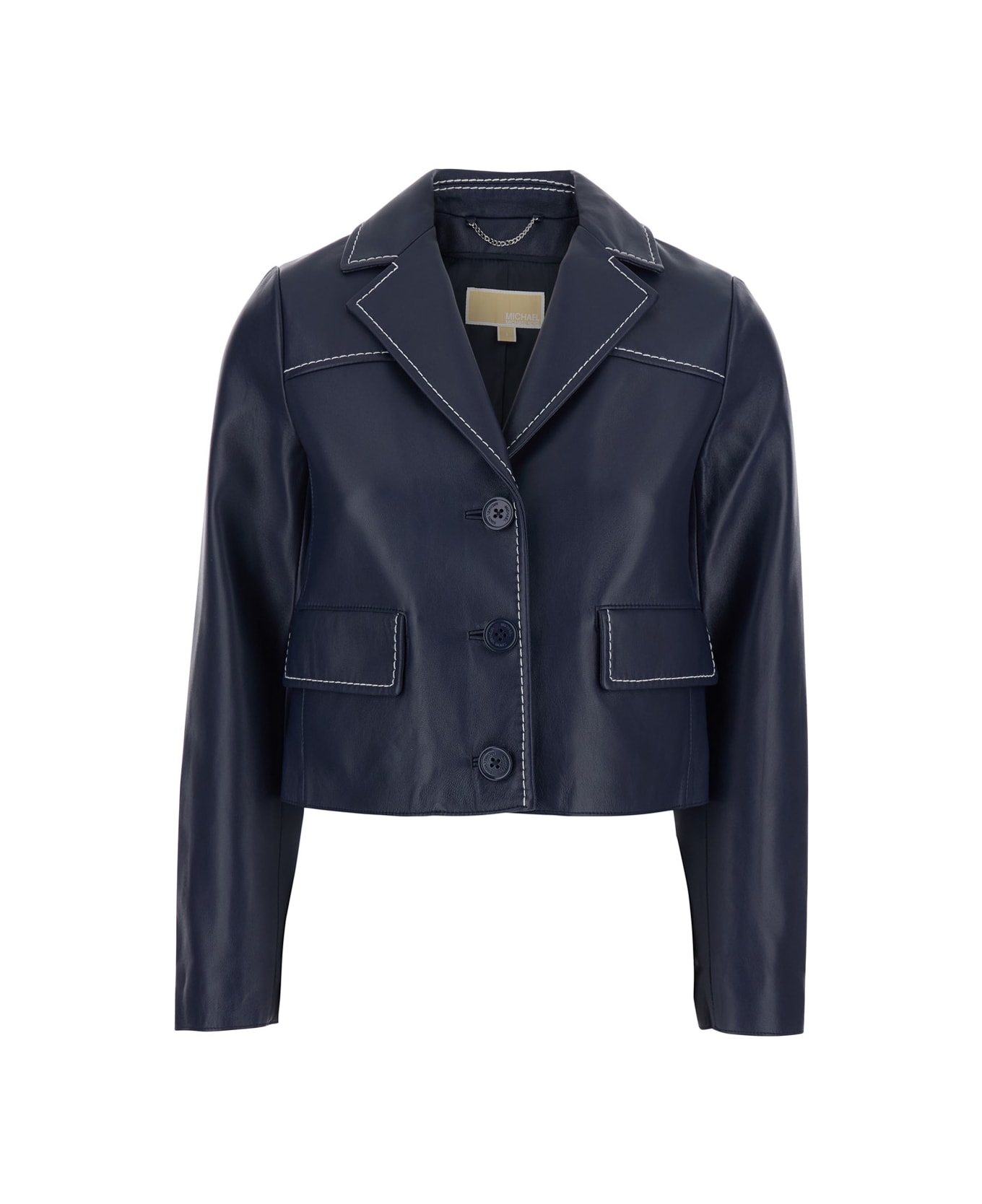 Jacket Blue Notched revers Long sleeves Front button closure Two flap pockets on the front Straight hem Contrast stitching Leather Regular fit