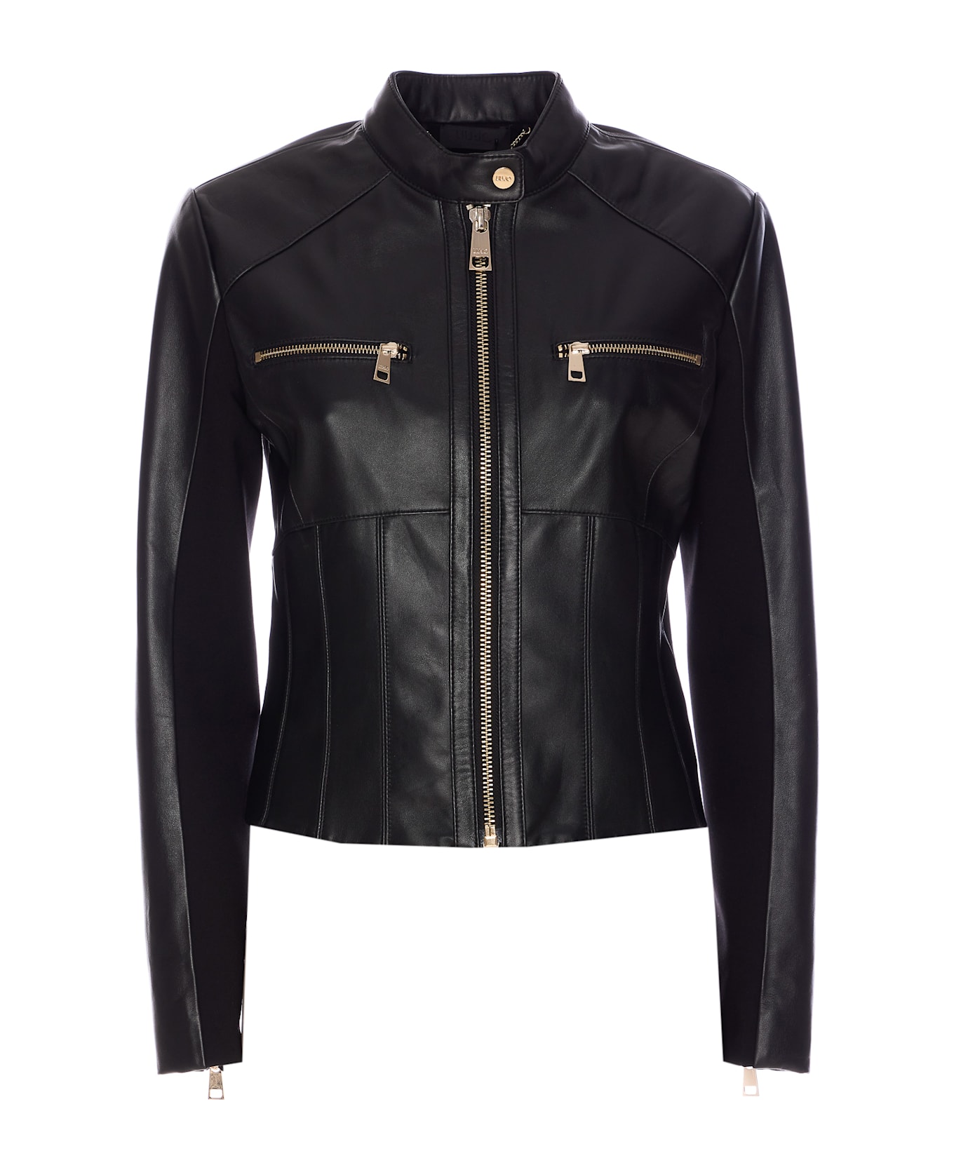 Liu Jo black leather jacket with frontal zip closure, crewneck frontal button, long sleevs, zip pocket on the front Composition: 100% Leather, 66% Viscose, 30% Polyamide, 4% Elastane, 100% Polyester