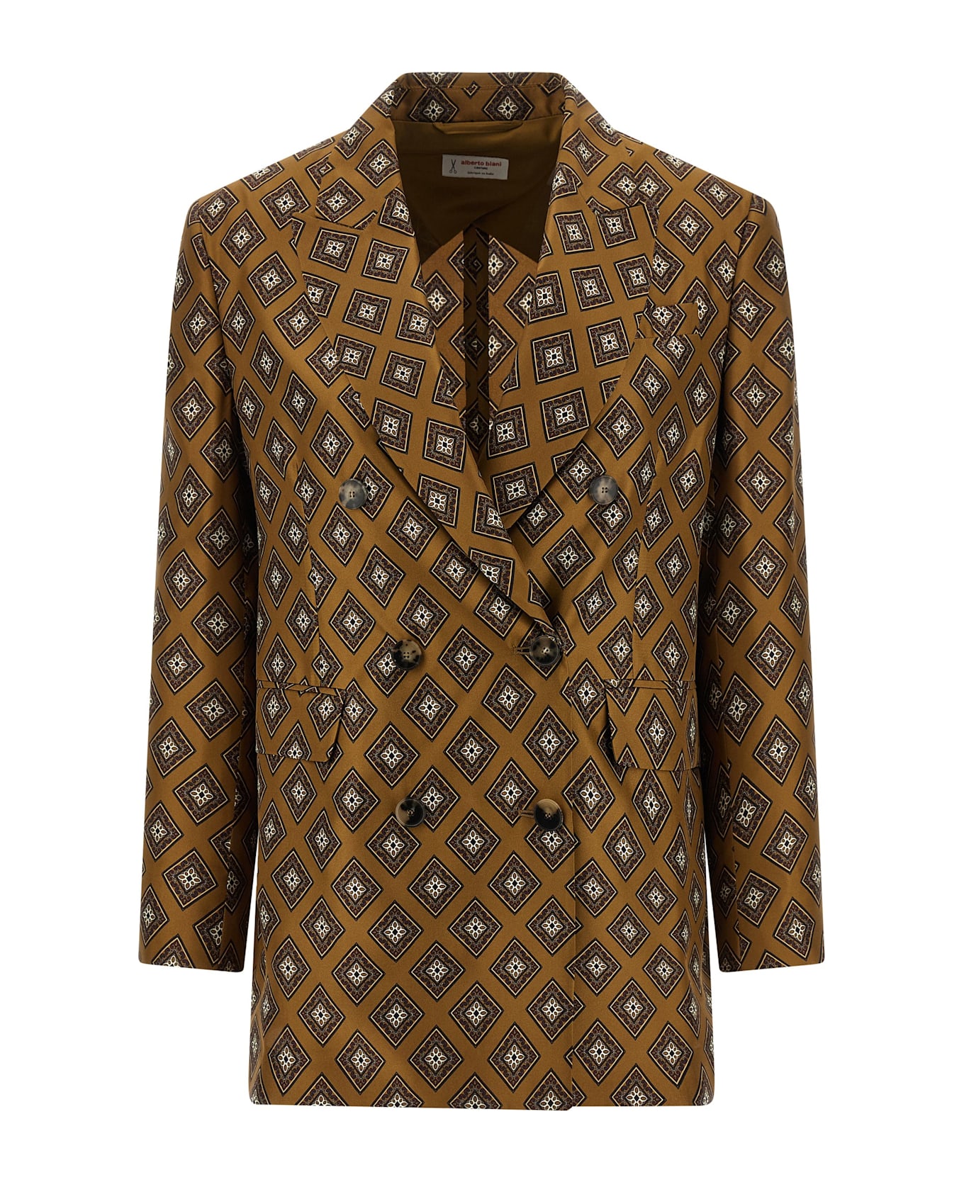 Double-breasted silk tie blazer with front horn button closure, peak lapels, chest pocket, flap pockets, padded shoulder, long sleeves, back vents, unlined. Composition: 100% silk