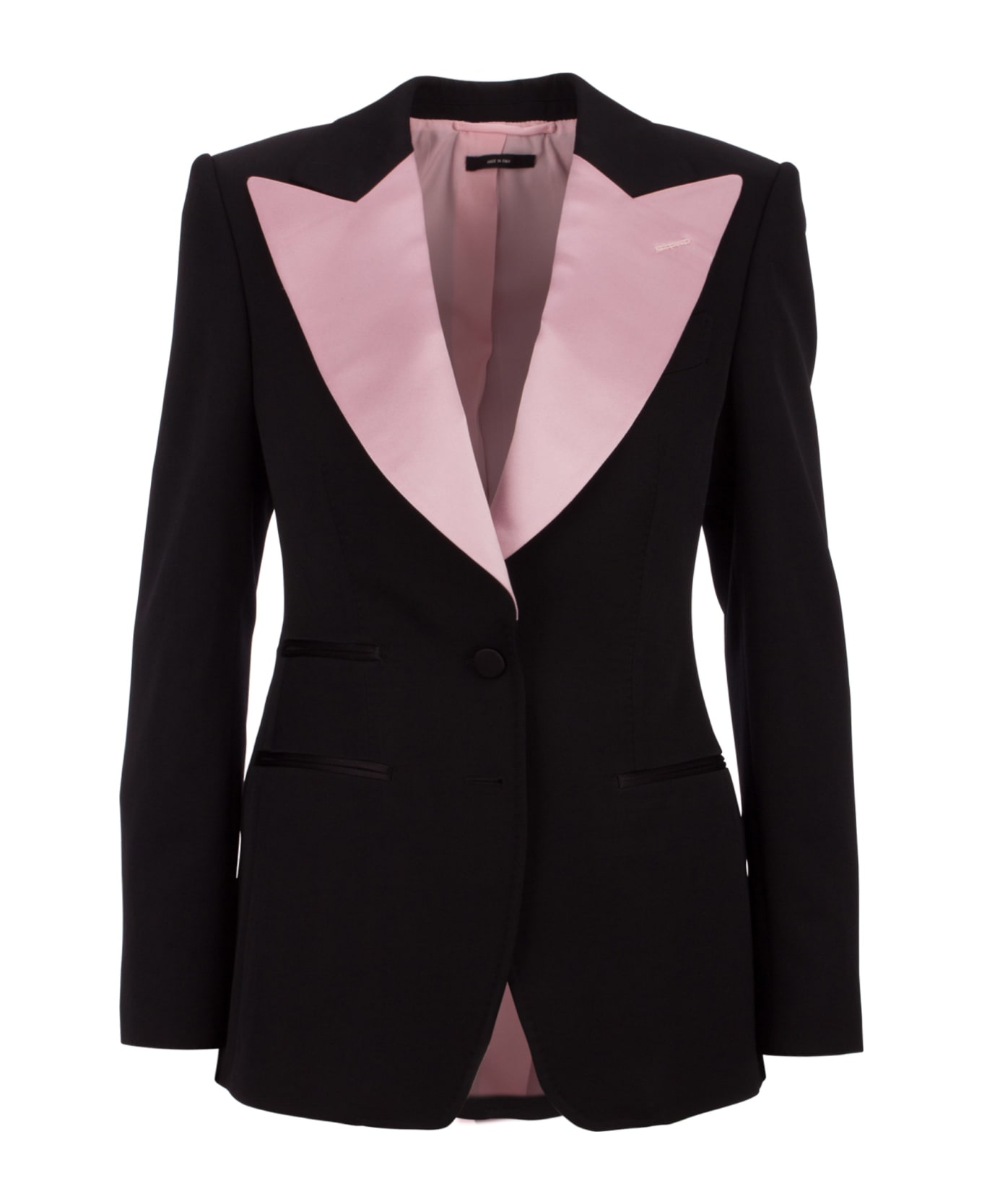 Black smoking blazer in wool, button closure, peaked satin pink contrasted revers, front pockets, back split 100% Wool Item in photo corresponds to a 38 IT Size Mannequin size: 42 IT Mannequin measures: Height 199cm, Bust/Breast 85cm, Waist 69cm, Hips 90cm, Shoulder 40cm, Neck 33. 5cm