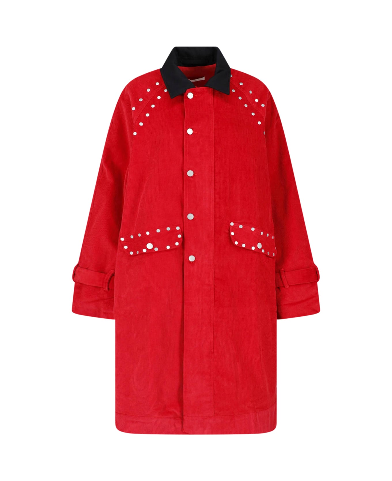 - Coat Joaquin Gimaguas in red velvet - Ribbed design - Classic black contrast collar - Button closure - Studs application front and back - Two front button pockets - Cuff straps