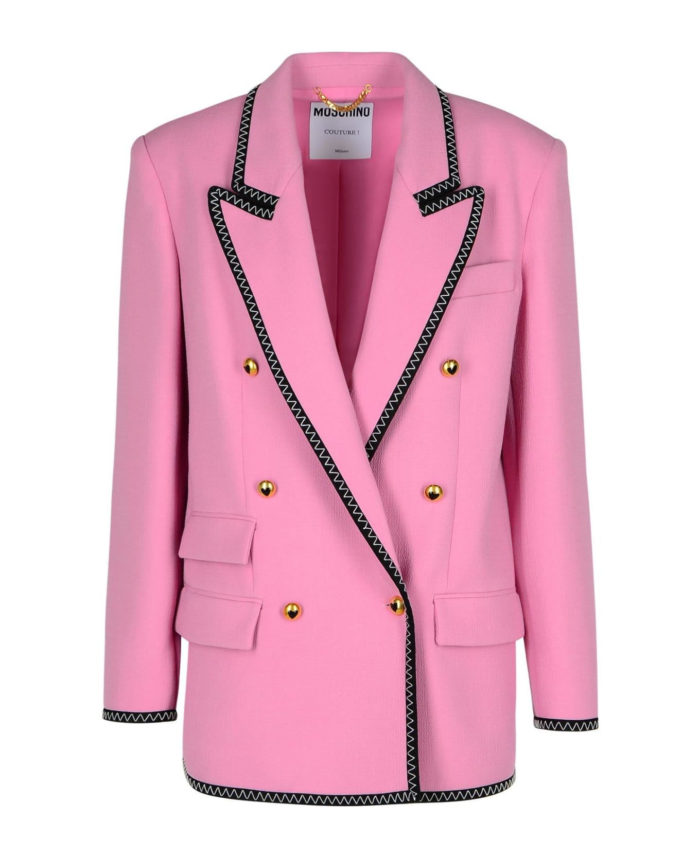 Made of viscose and wool blend, V neckline, double-breasted closure with logo buttons, contrasting profiling, padded shoulders, three-pocket model, cuffs finished with buttons