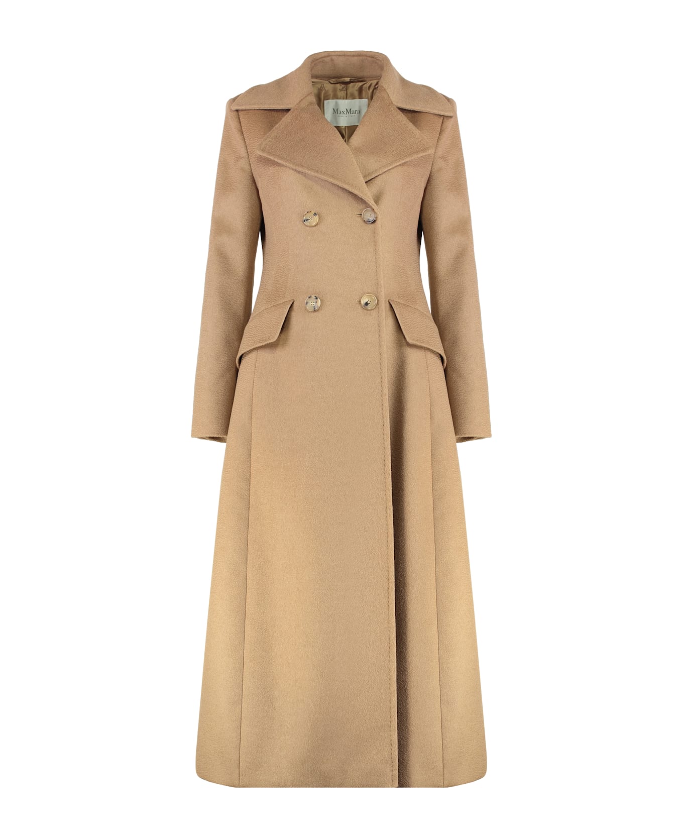 Heavy camel coat with flared line and martingale at the back waist. double-breasted closure with buttons and lapel collar. the lining is made of monogram jacquard fabric.