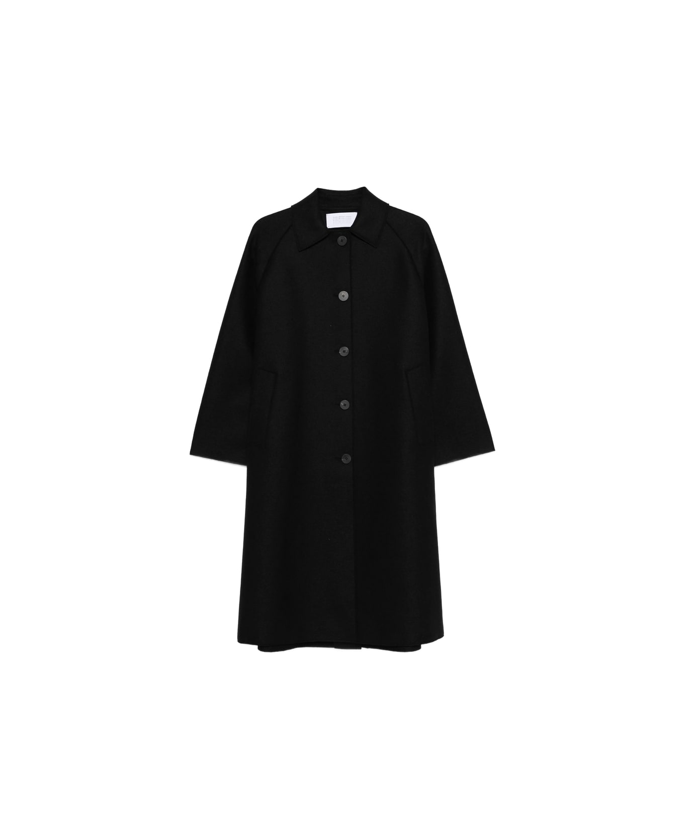 black raglan sleeves button front fastening welt pockets collared neckline straight hem wool