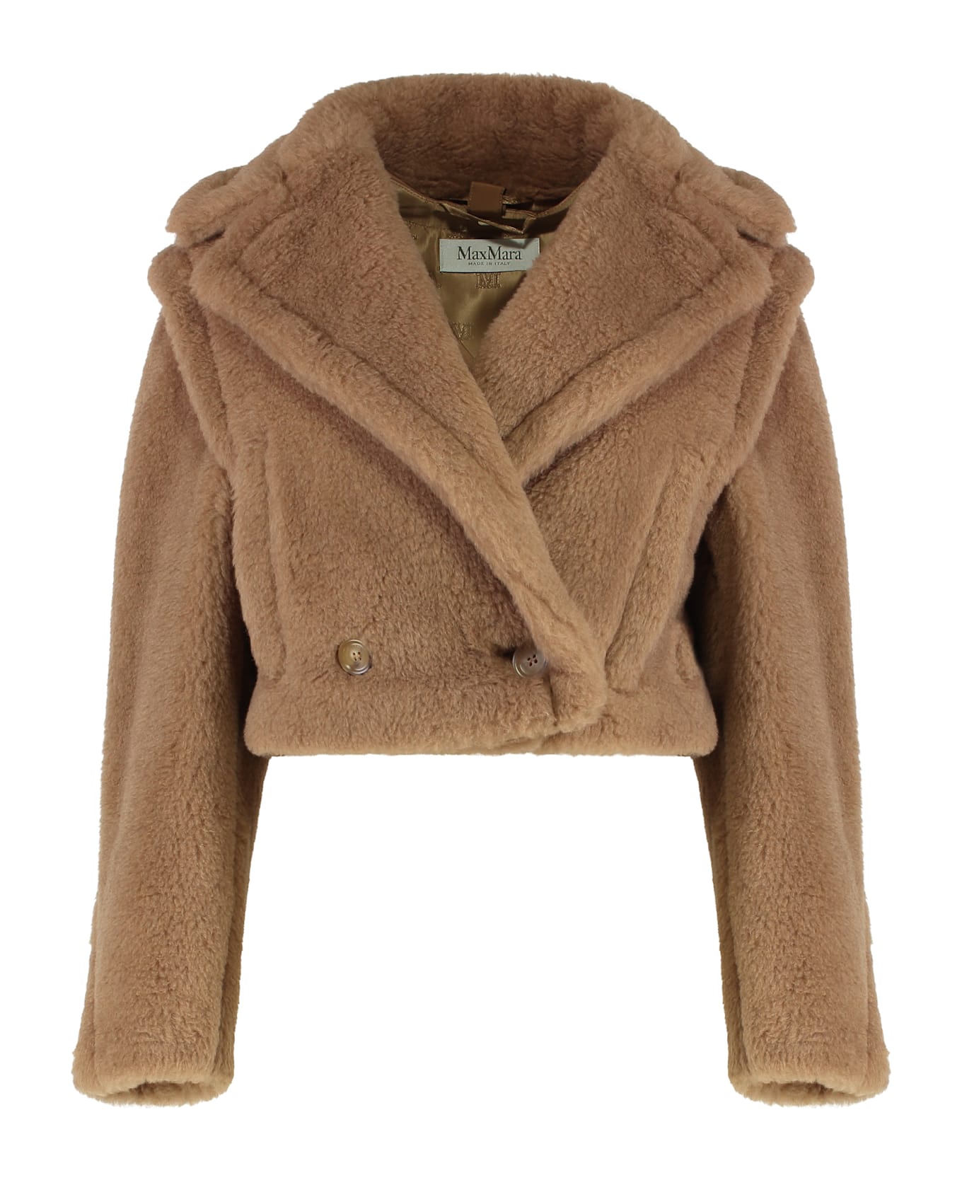 Crop jacket inspired by the iconic teddy bear, featuring a removable padded inner jacket in quilted cameluxe and sleeves in teddy fabric. it has a wide lapel collar with a double-breasted front closure with two buttons. perfect for completing a casual outfit or adding a touch of comfort to winter looks.