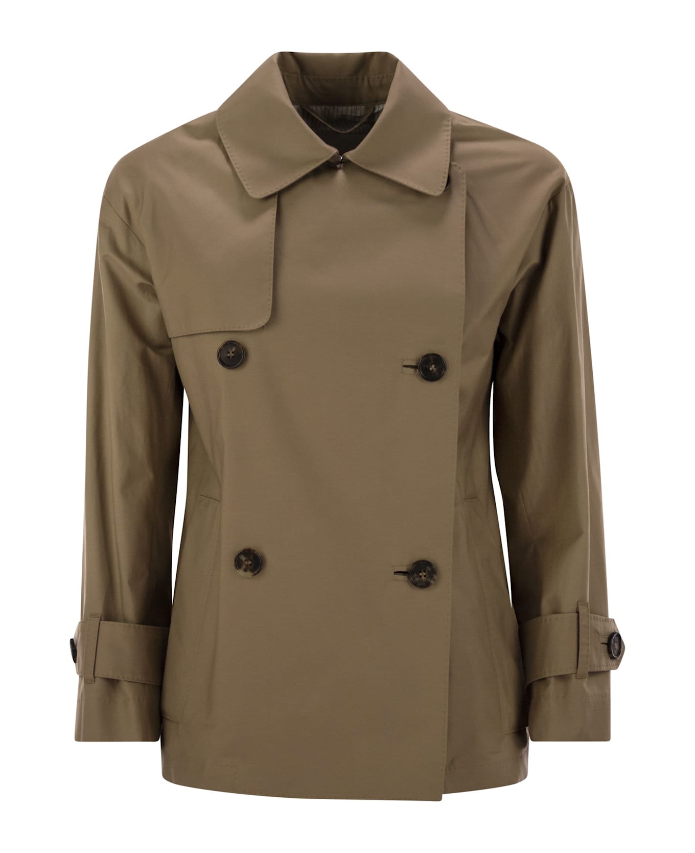 Double-breasted short trench coat in technical cotton twill with a shirt collar, cape back and long sleeves with dropped shoulders and adjustable frogs on the cuffs. Finished with asymmetrical bib on the front, worn right side, welt pockets on the hips and central back vent. Semi-lined model in taffeta with jacquard logo ribbon details, finished with tailoring dot. Front fastening with horn buttons. The main fabric contains at least 50% organically grown cotton fibre. - Button fastening - Double-breasted - Shirt collar DESIGNER ID: 2519021044600 004