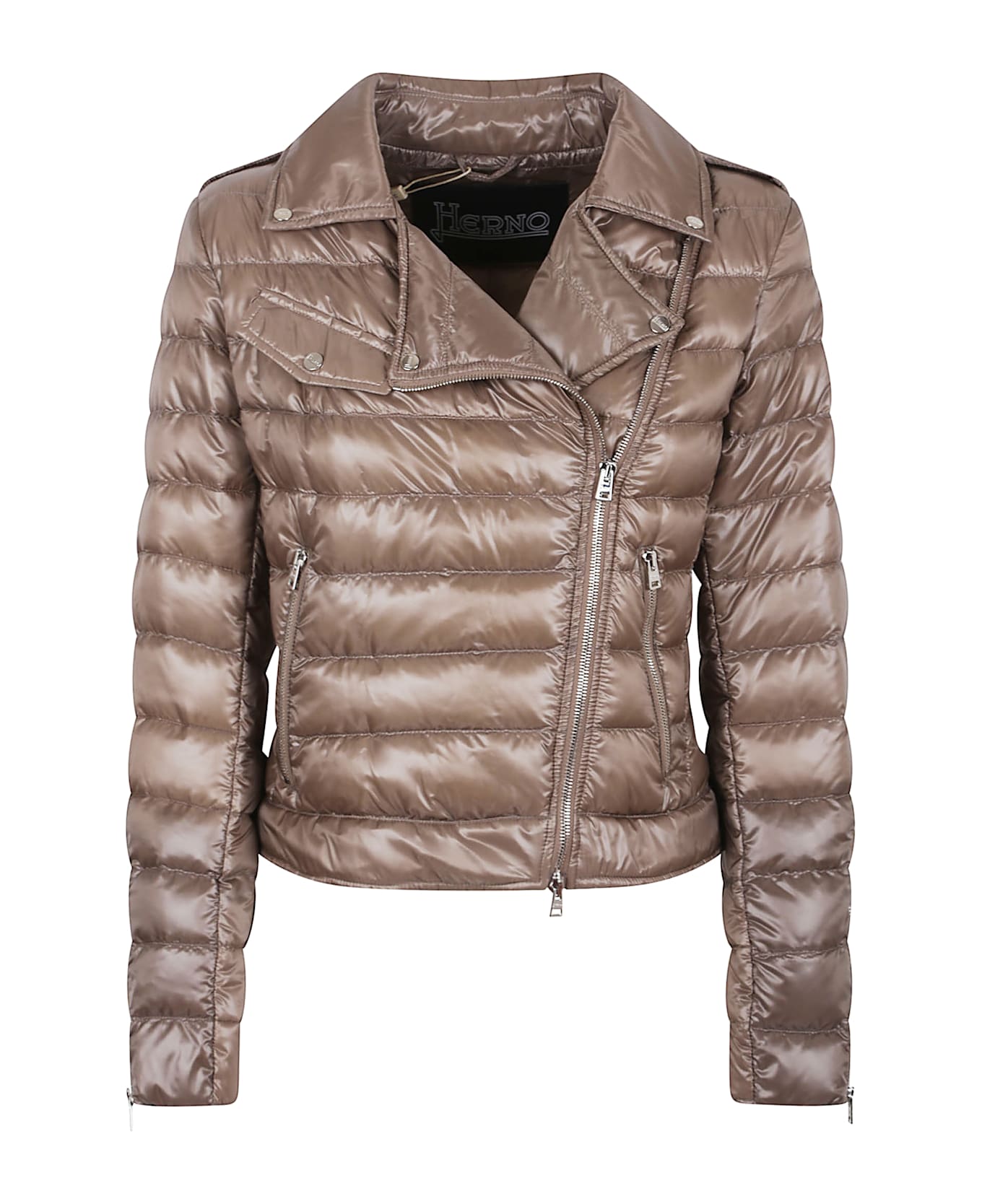 Bomber jacket made from HERNO`s iconic Ultralight Nylon. Down padding; lapel collar; long sleeves; diagonal zip fastening; zipped cuffs; pocket with flap and snap button and zipped pockets; regular fit. Design inspired by the lines of the classic biker jacket, which features a choice of 20 denier Japanese Nylon and a high-quality 90/10 injected down to offer an even lighter feel. The result is good water resistance with a particularly luxurious tactile effect similar to silk.