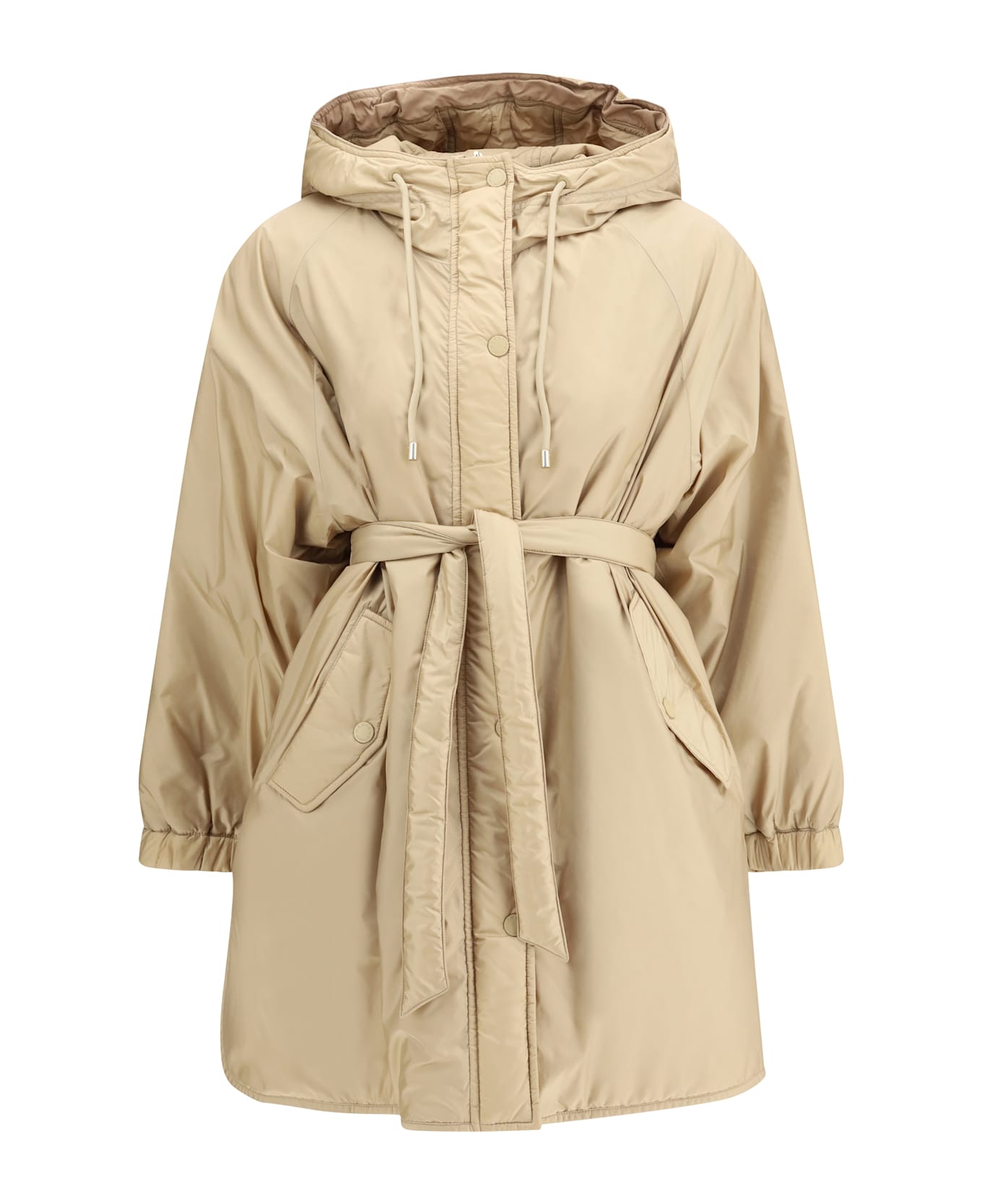 The veranda down jacket by max mara weekend is a lightweight and refined garment, perfect for completing casual and sophisticated looks. featuring an adjustable hood with drawstring and snap button closure, it has a matching belt that can be tied at the waist to define the silhouette. the two welt pockets with flaps add practicality, making this down jacket a versatile and functional must-have for the season.