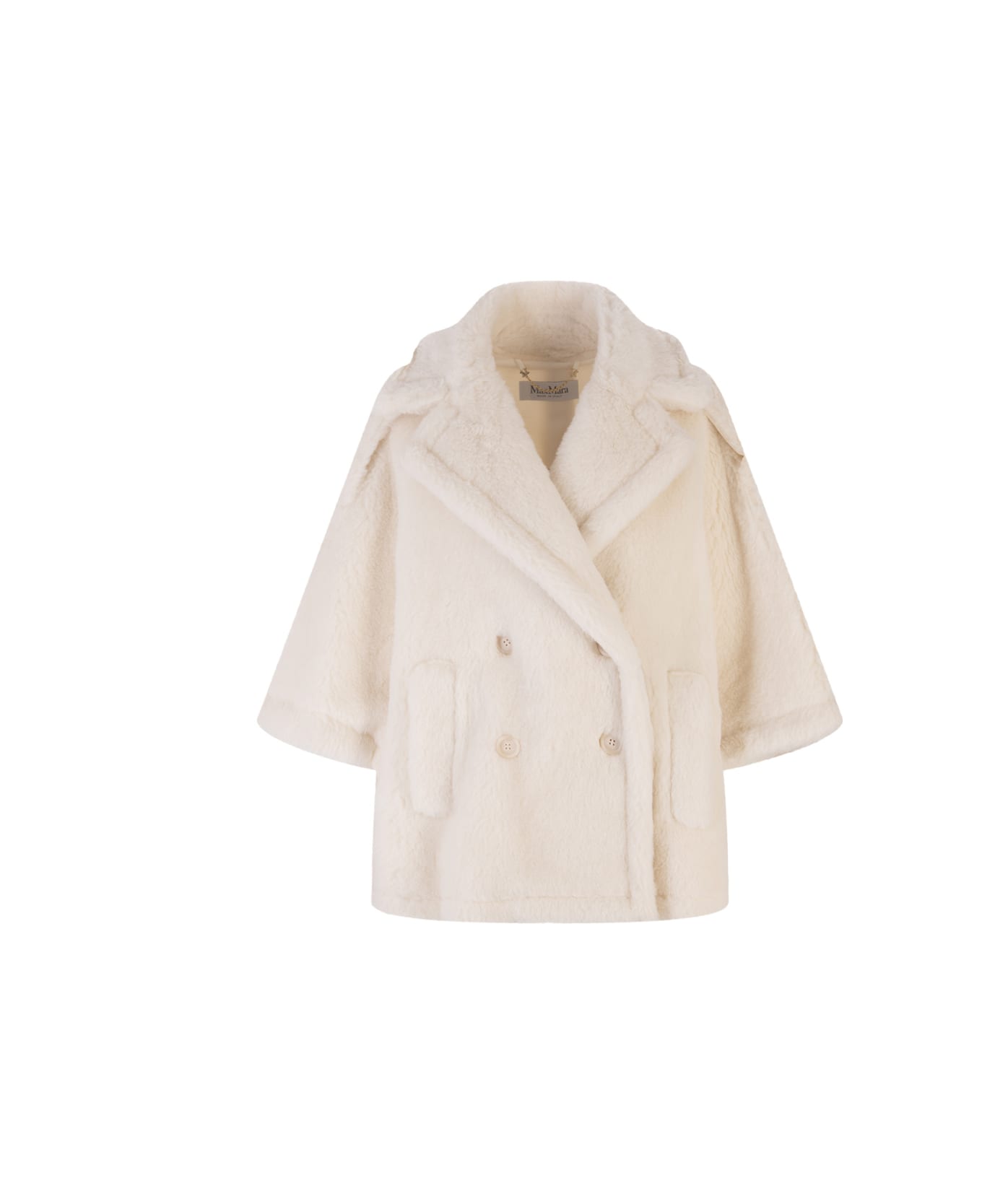 Ivory Placido short cape by Max Mara made of alpaca and wool Teddy fabric on a silk base, featuring a lapel collar, welt pockets, short sleeves and a double-breasted design. Front button fastening. Length: 65 cm.
