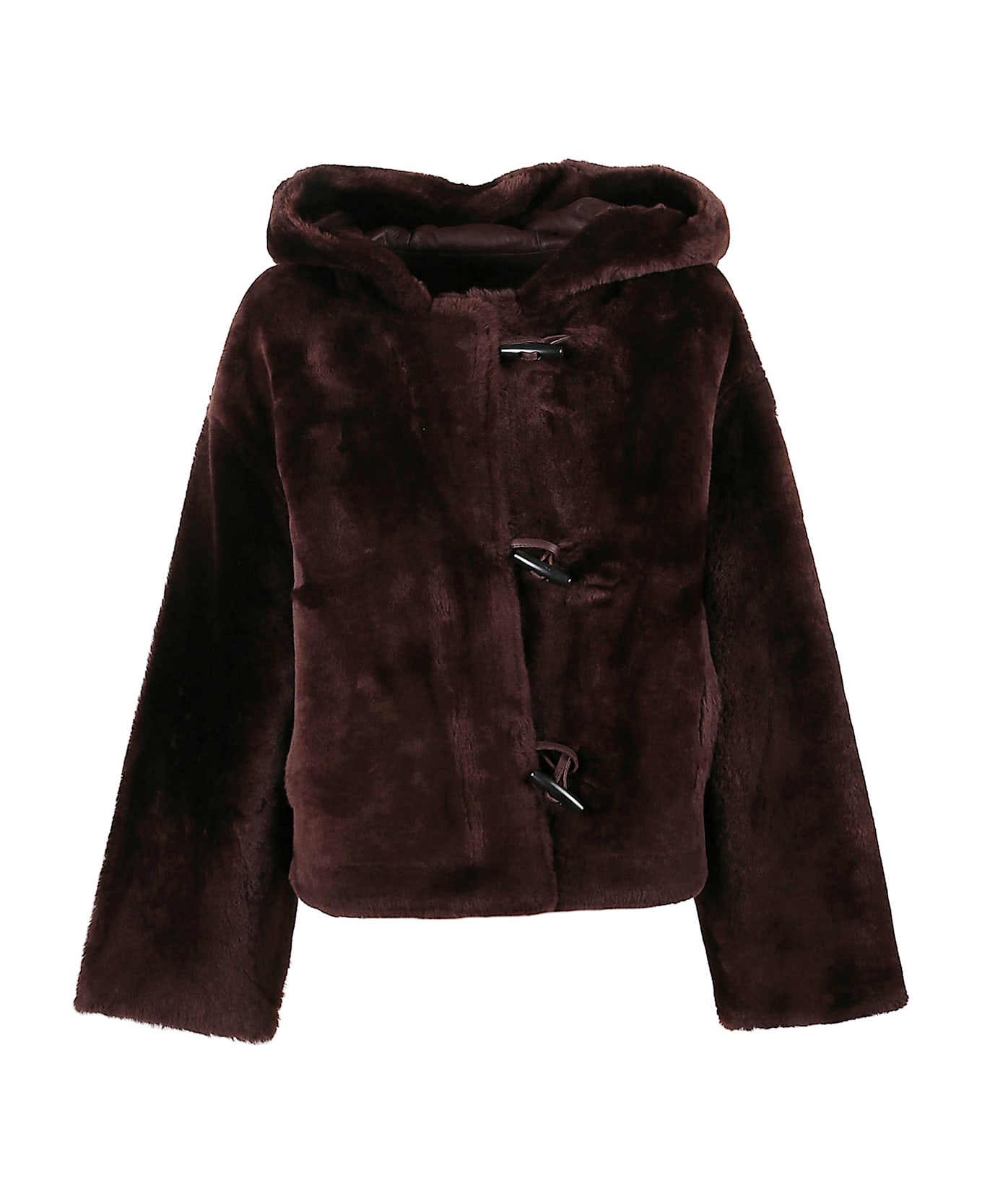 YVES SALOMON 52cm side zip jacket in purple lambskin, featuring a hood and contrasting black toggle fastening.