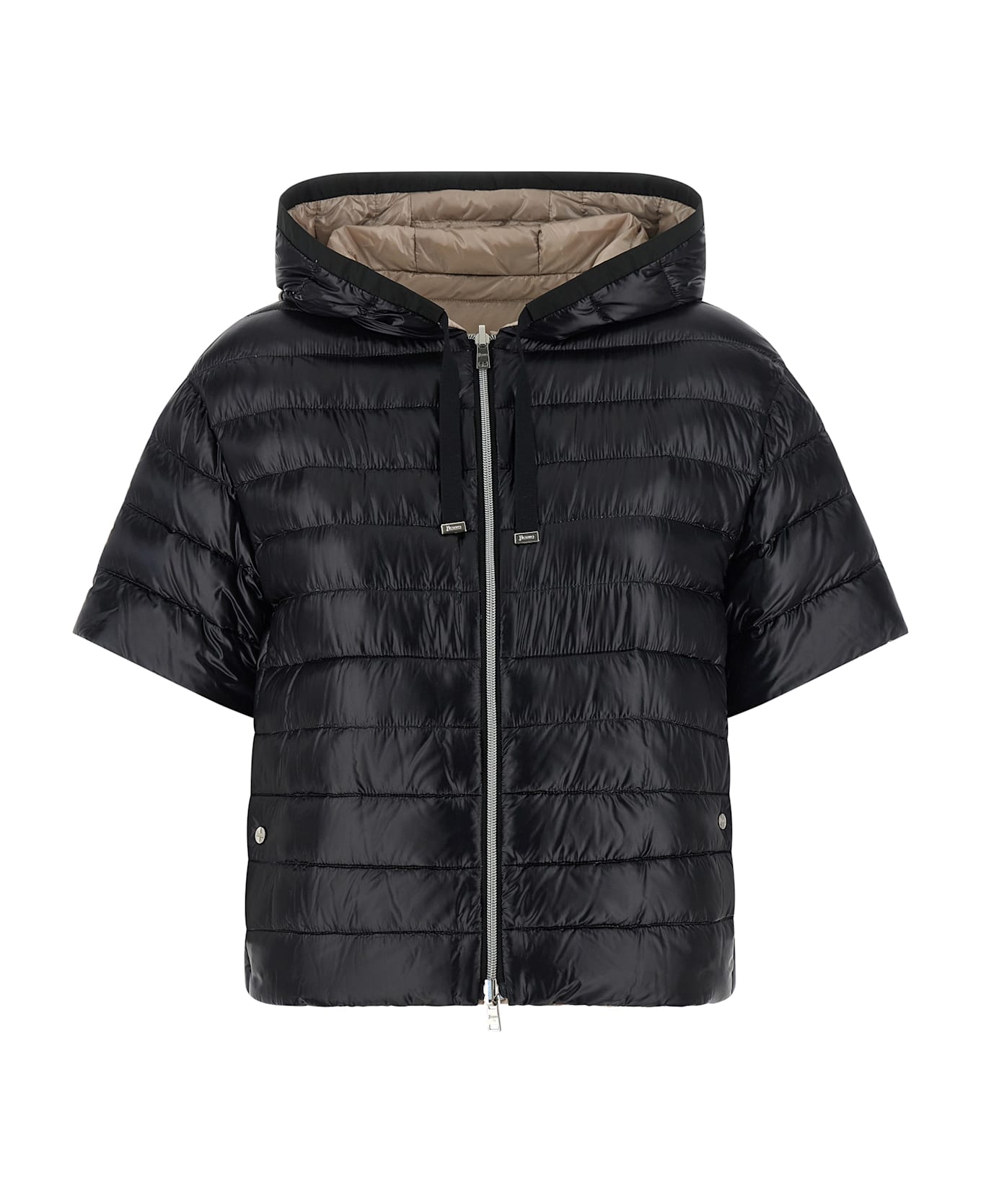 Reversible short-sleeved down jacket with ultralight nylon hood, goose down padding, quilted padding, zip closure, vertical side pockets with automatic closure. Composition: 100% polyamide
