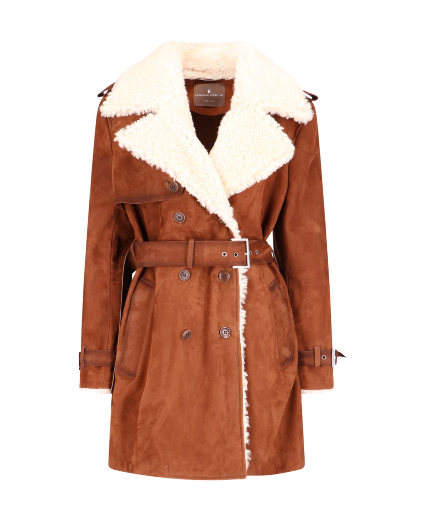 Ermanno Scervino shearling midi coat in brown suede with cream shearling details, inner fur design, double-breasted, classic revers, button closure, adjustable straps on cuffs, tone-on-tone adjustable belt at the waist, two side flap pockets, deep central vent at the back, straight hem.