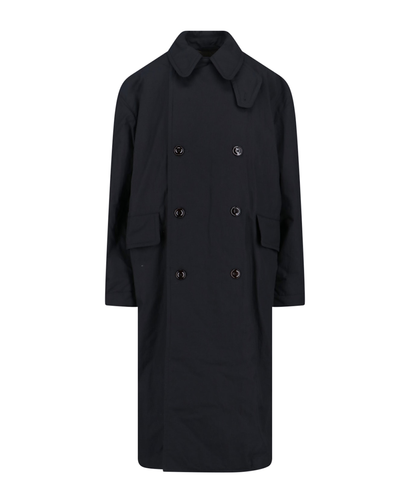 Our Legacy Whale Coat coat in black fabric with round collar, double-breasted, button closure, long sleeves, two front pockets, and straight hem. Composition: 71% Lyocell, 29% Polyamide