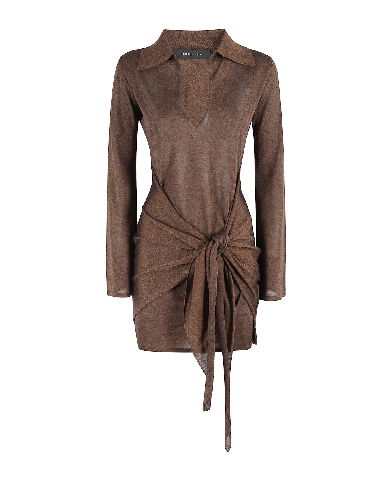 Flexage Knot Dress - Federica Tosi - Bronze color - Stretch fabric - Polo collar - Long sleeve flared at hem - Double knot sash - Regular fit