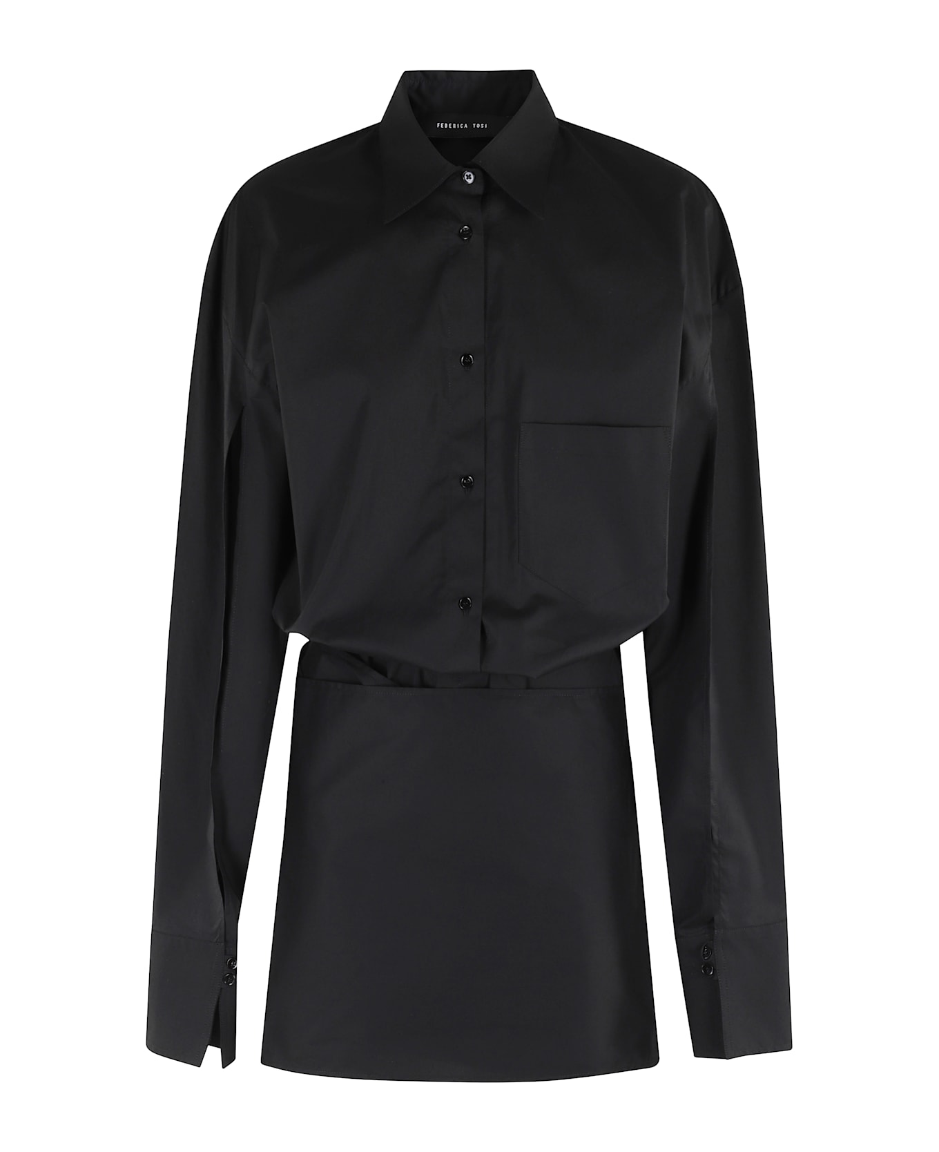Pareo Mini Dress - Federica Tosi - Black color - Cotton fabric - Classic collar - Long cut-out sleeve - Mini pareo skirt with drawstring - Front button closure - Regular fit