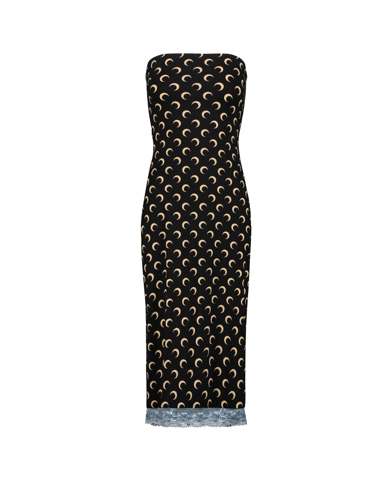 Marine Serre bustier dress in recycled jersey with all-over moon print, contrasting color lace applied on the bottom. GTIN code:WDR333BCJER0001