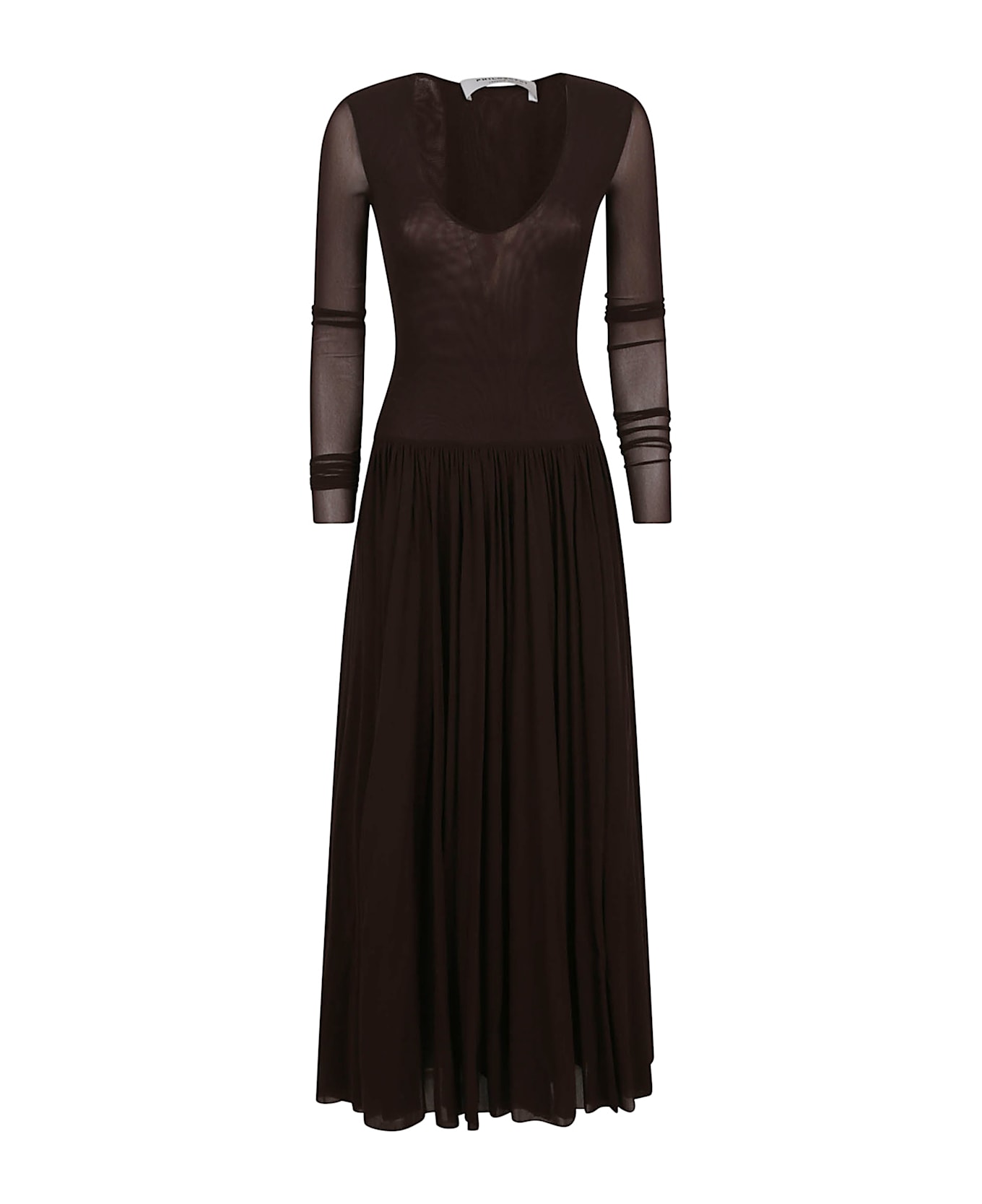 Italiano Inglese brown dress carousel neckline semi-sheer panels ruffled details